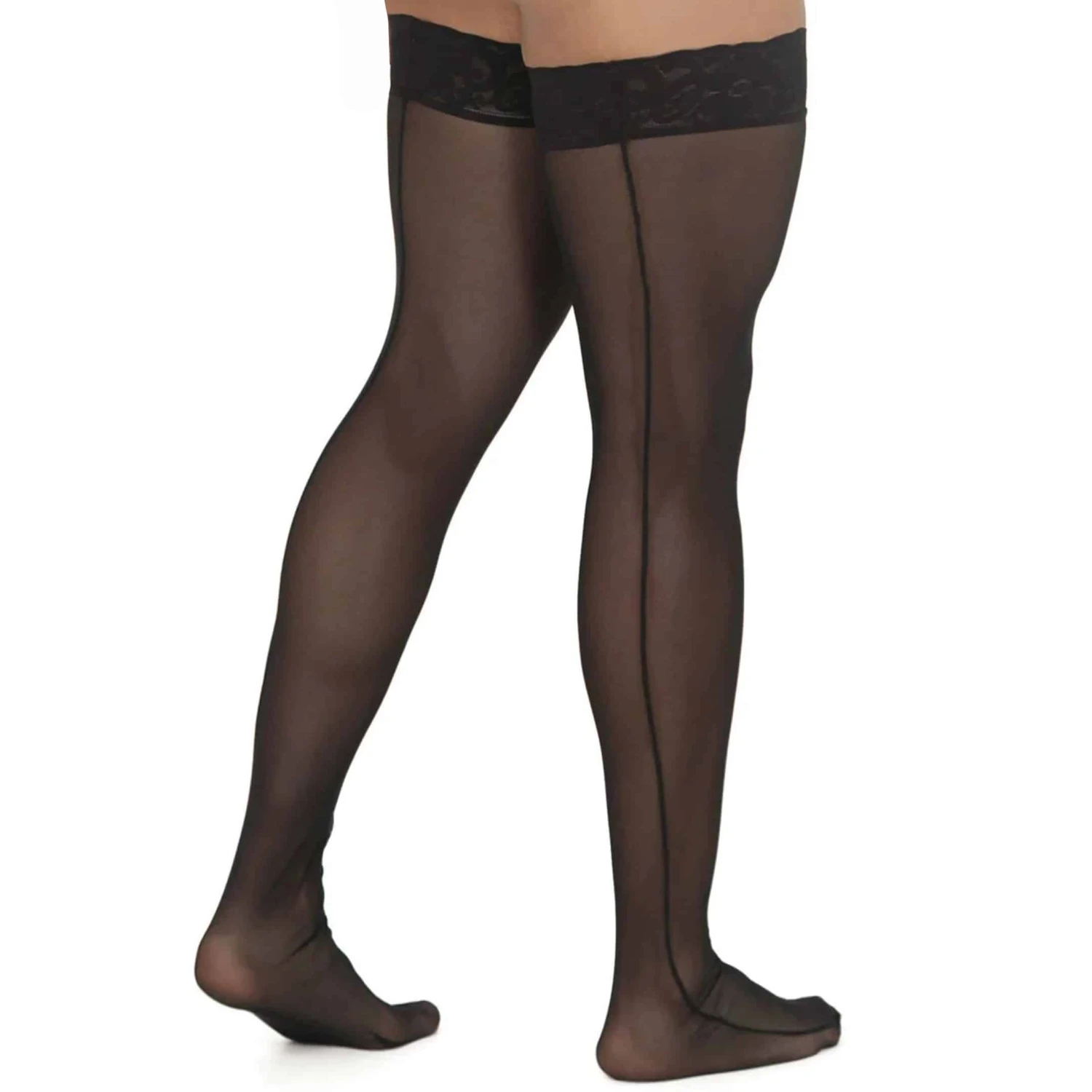 Paire de bas en résille transparente. Dentelle sur la partie supérieure. Bande antidérapante en silicone pour maintenir les collants en haut des cuisses. Taille unique.
