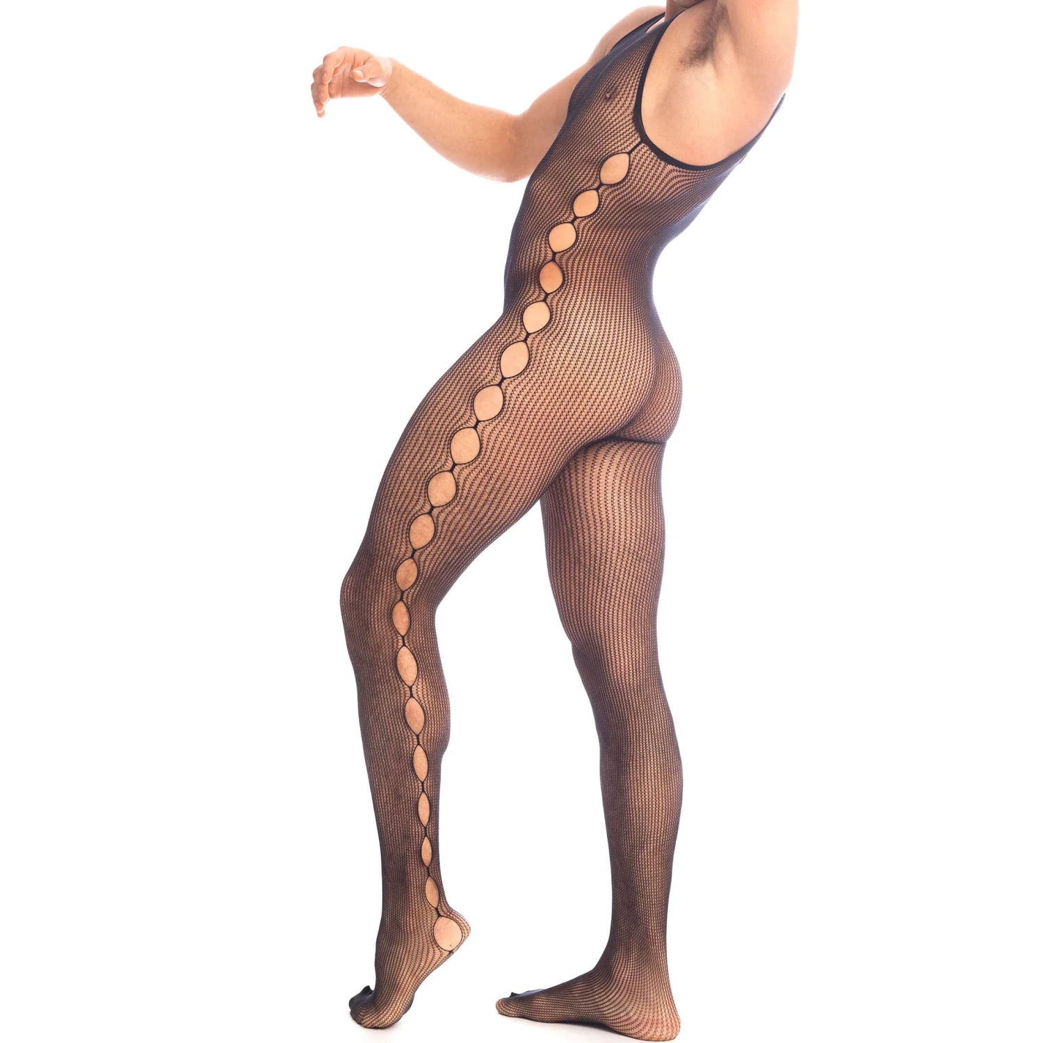 Body intégral en maille extensible et ajourée, pour tout dévoiler. Finitions sans coutures. A porter à même la peau ou par-dessus un sous-vêtement.