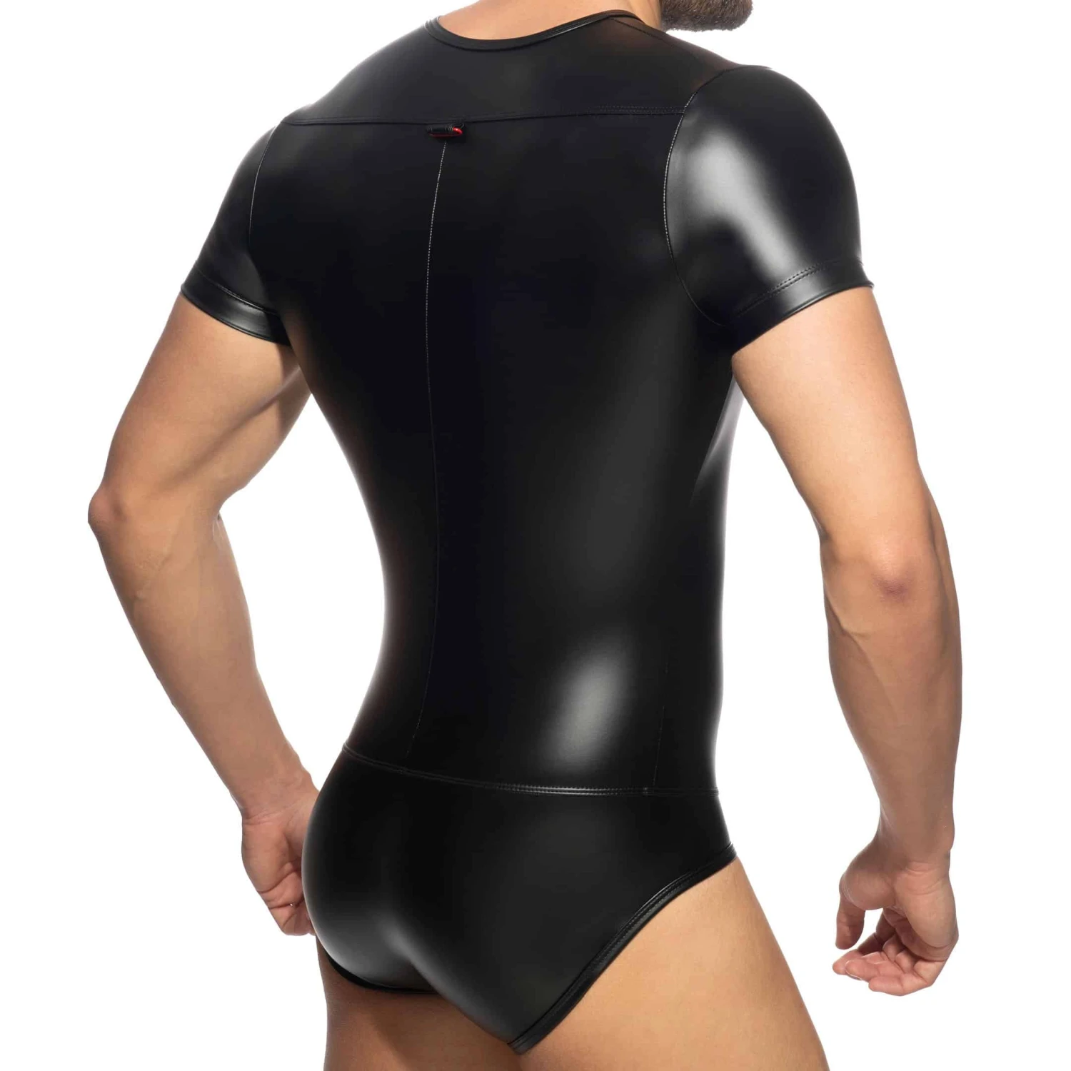 Body innovant en microfibre brillante imitant le caoutchouc, pour un look très fetish. Fermeture Eclair fonctionnelle pour un accès direct à vos parties. Technologie RingUp intégrant un anneau cock ring en silicone (diamètre 5 cm, amovible par bouton pression) pour une érection plus dure et plus longue. Anneau métallique de couleur contrastée en haut du dos. Logo AD en silicone sur la poitrine.