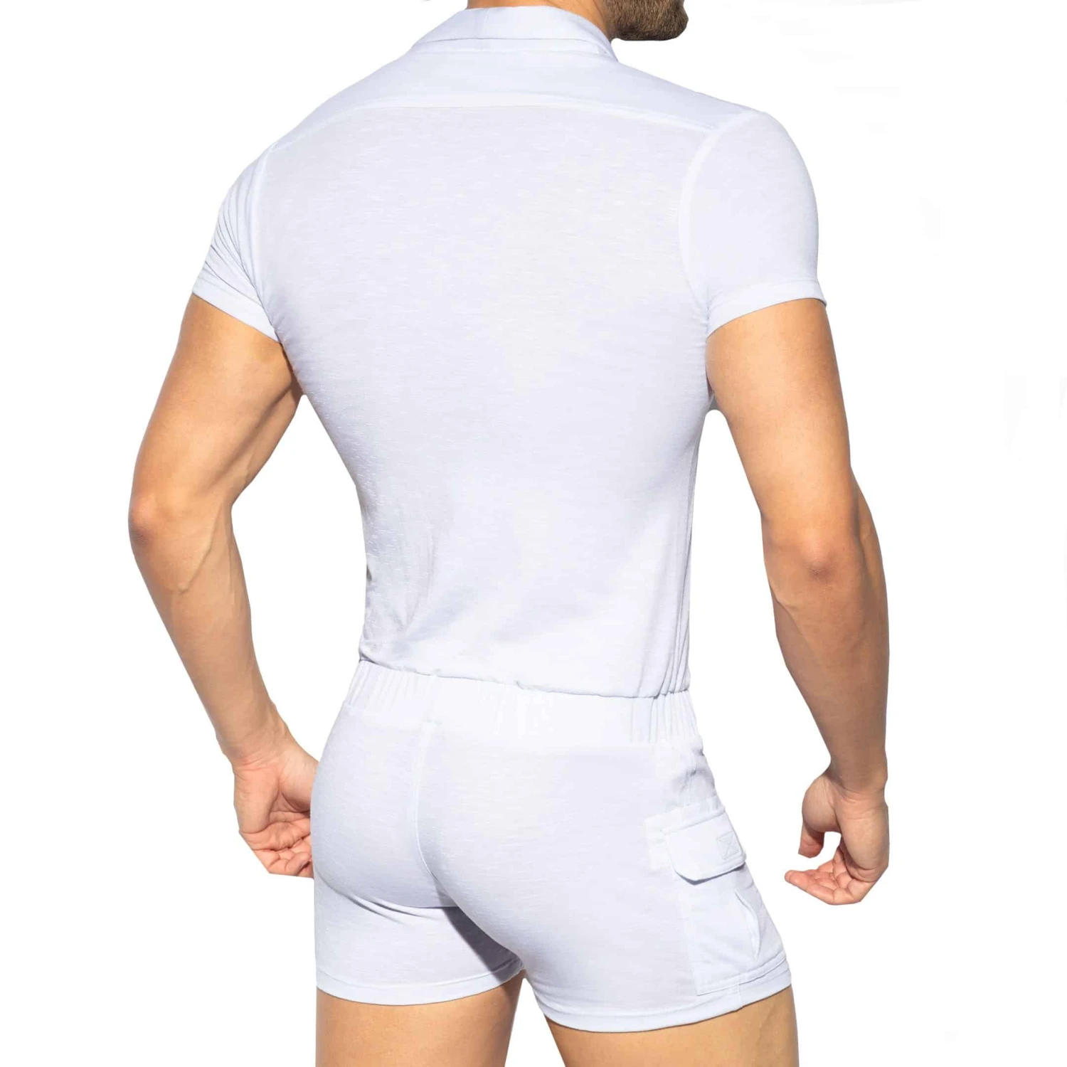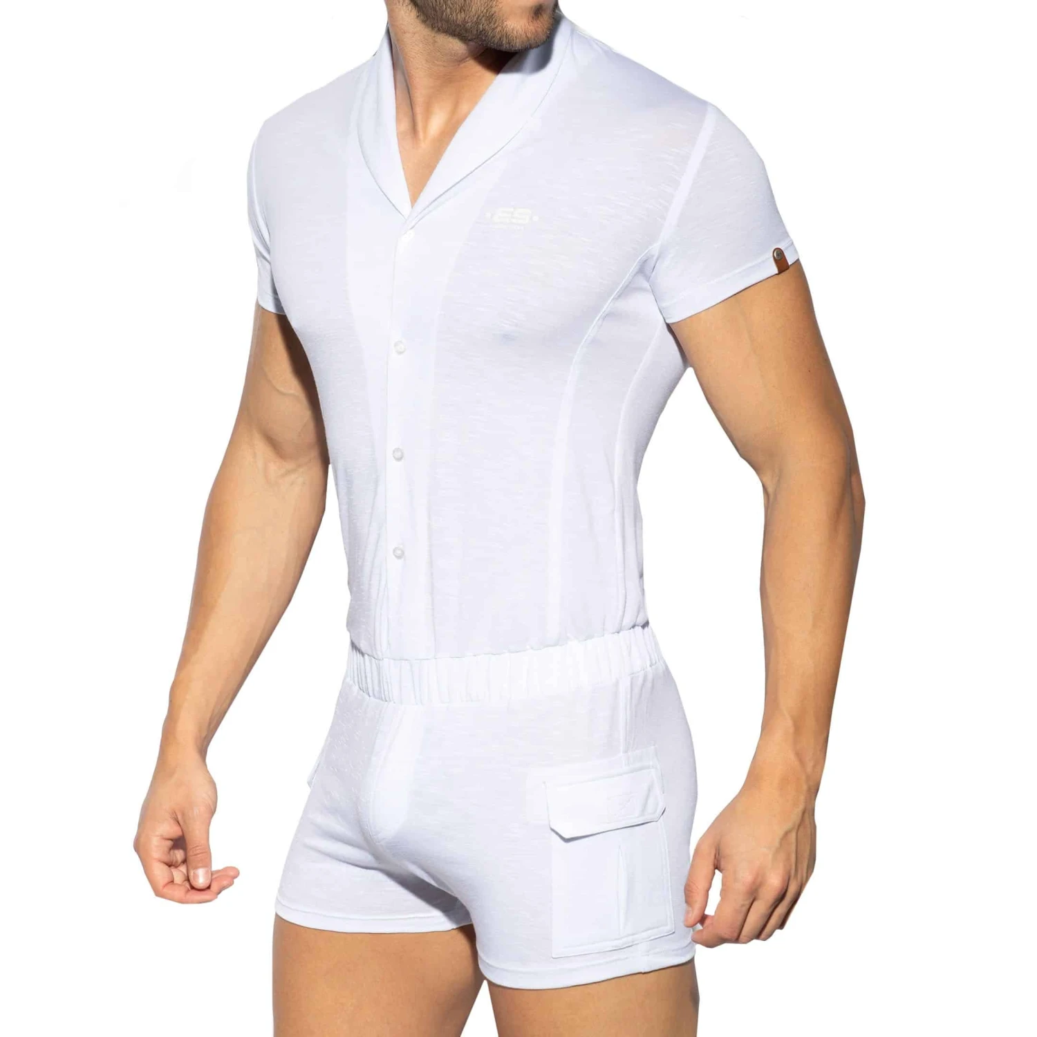 Body à manches courtes en microfibre fine, légère et respirante de couleur unie. Fermeture 4 boutons. Elegant col châle. 2 poches à rabat plaquées sur les cuisses. Elastique à la taille. Logo ES Collection sur la poitrine.