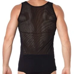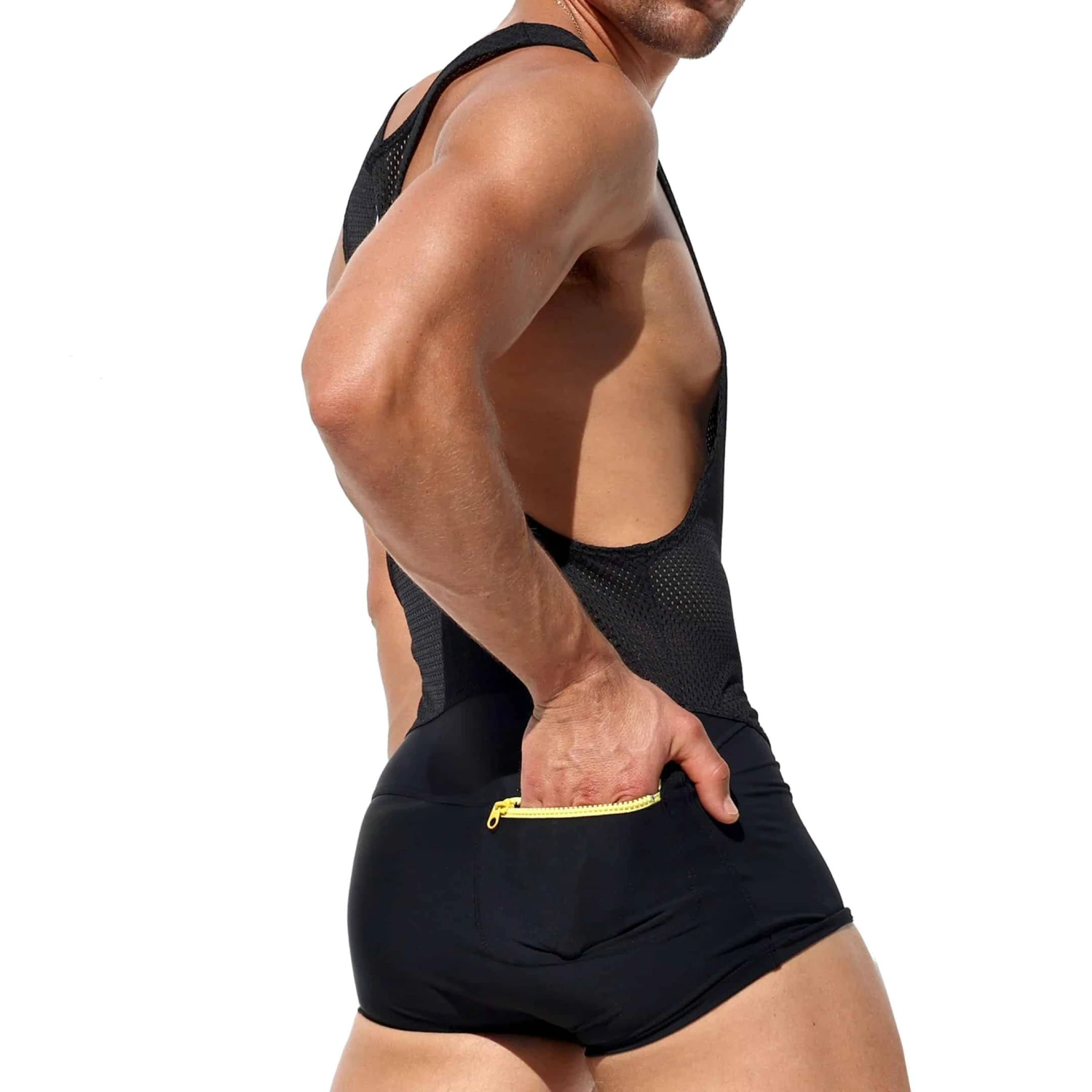 Body athétique léger et respirant combinant 2 matières conçus pour le sport. Partie supérieure en mesh ajouré. Partie inférieure en nylon extensible avec finition mate. Poche avec fermeture Eclair de couleur contrastée sur la fesse droite. Etiquette Rufskin dans le dos. Fabriqué en Californie.