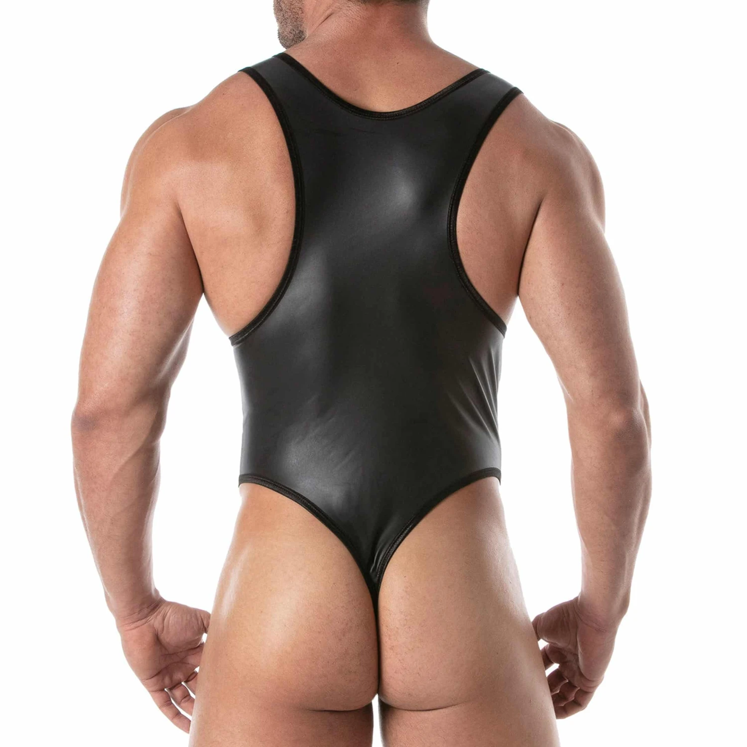 Body string sexy en simili-cuir extensible pour un look fetish. Coupe moulante très échancrée sur les hanches. Dos nageur. Bordures élastiquées. Logo TOF Paris sur la poitrine.