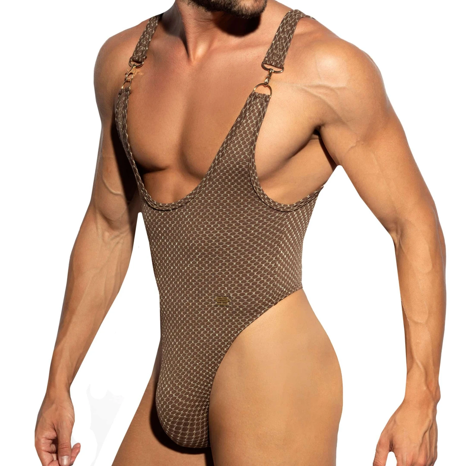 Body string très luxueux en microfibre brodée de fils métallisés Lurex pour un effet cotte de maille. Un maillot de bain original pour les plus audacieux. Mousquetons dorés sur les bretelles. Poche frontale moulée sans couture pour un confort optimal. Logo ES Collection en silicone.