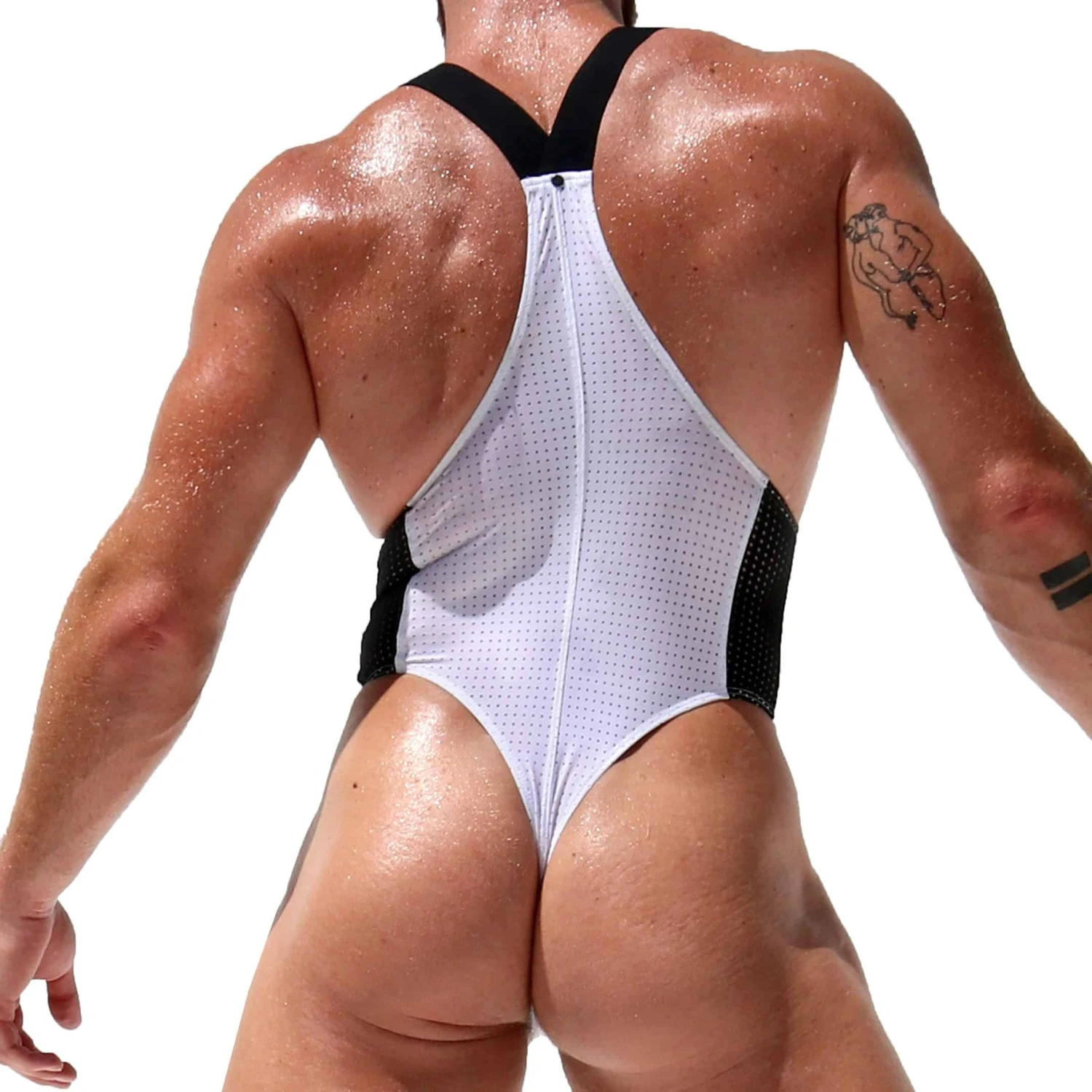 Body string en Nylon extensible microperforé. Bandes sport sur les côtés. Coupe très échancrée sur les hanches. Dos nageur. Bretelles élastiques douces et confortables. Fabriqué en Californie.