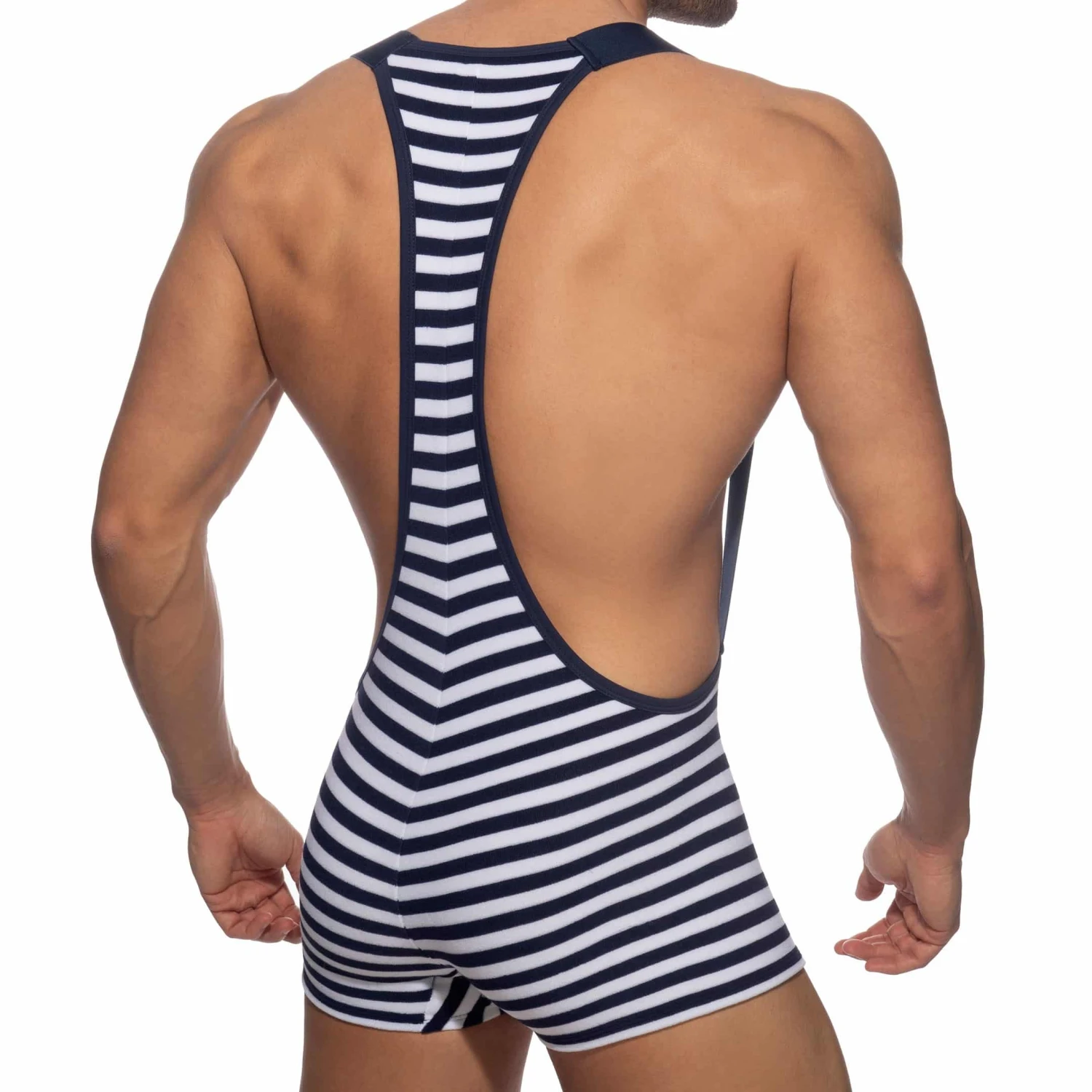 Body en microfibre aussi douce que du velours. Rayures façon marinière. Larges bretelles élastiques. Poche frontale push up. Etiquette AD en silicone sur la cuisse gauche.