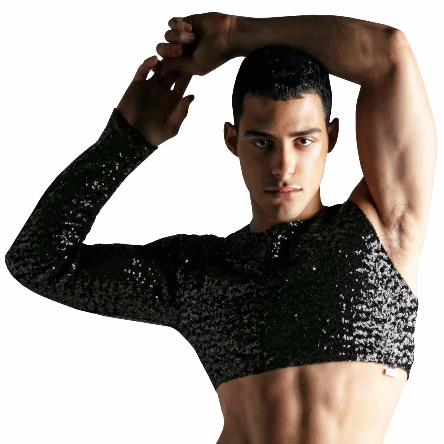 Crop top asymétrique en microfibre stretch semi-transparente recouverte de paillettes. Sans manche à gauche et manche longue à droite. Plaque métallique Modus Vivendi.