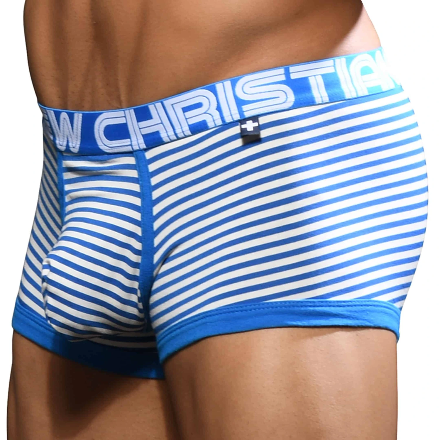 Boxer taille basse en coton doux et confortable. Elégante rayure nautique. Ouverture façon kangourou. Poche Almost Naked, qui épouse et soutient les organes génitaux, sans les comprimer. Ceinture élastique amincissante signée Andrew Christian. Edition limitée.