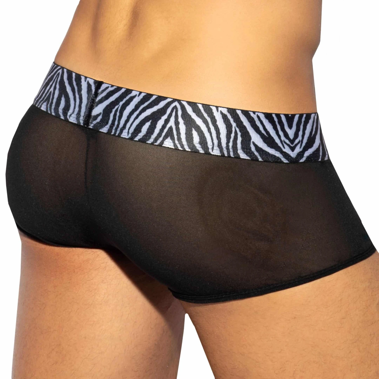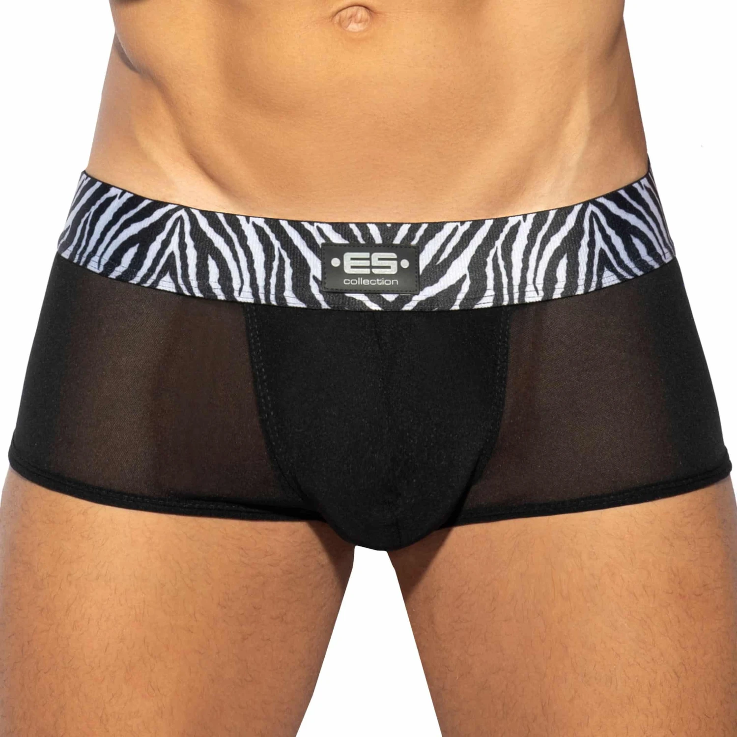 Boxer taille basse très ajusté en tulle extensible et transparent. Poche frontale push-up pour pour un excellent maintien et une valorisation de votre masculinité. Ceinture élastique imprimée d’un motif zèbre. Logo ES Collection en silicone.