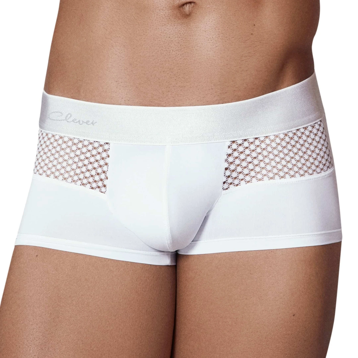 Boxer sexy en microfibre extensible, douce et confortable. Empiècements en résille transparente sur les côtés et en haut des fesses. Poche frontale ergonomique non doublée. Ceinture élastique signée Clever.