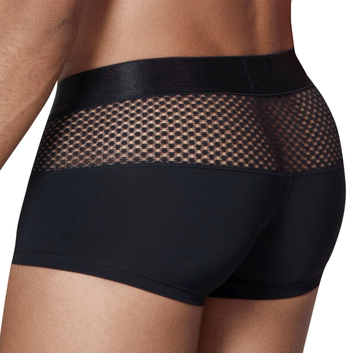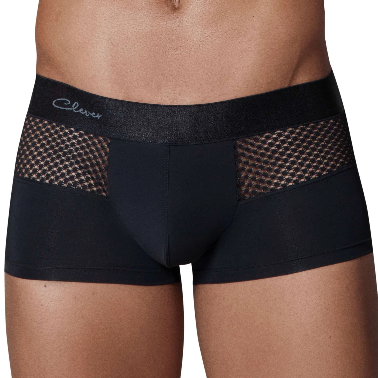 Boxer sexy en microfibre extensible, douce et confortable. Empiècements en résille transparente sur les côtés et en haut des fesses. Poche frontale ergonomique non doublée. Ceinture élastique signée Clever.