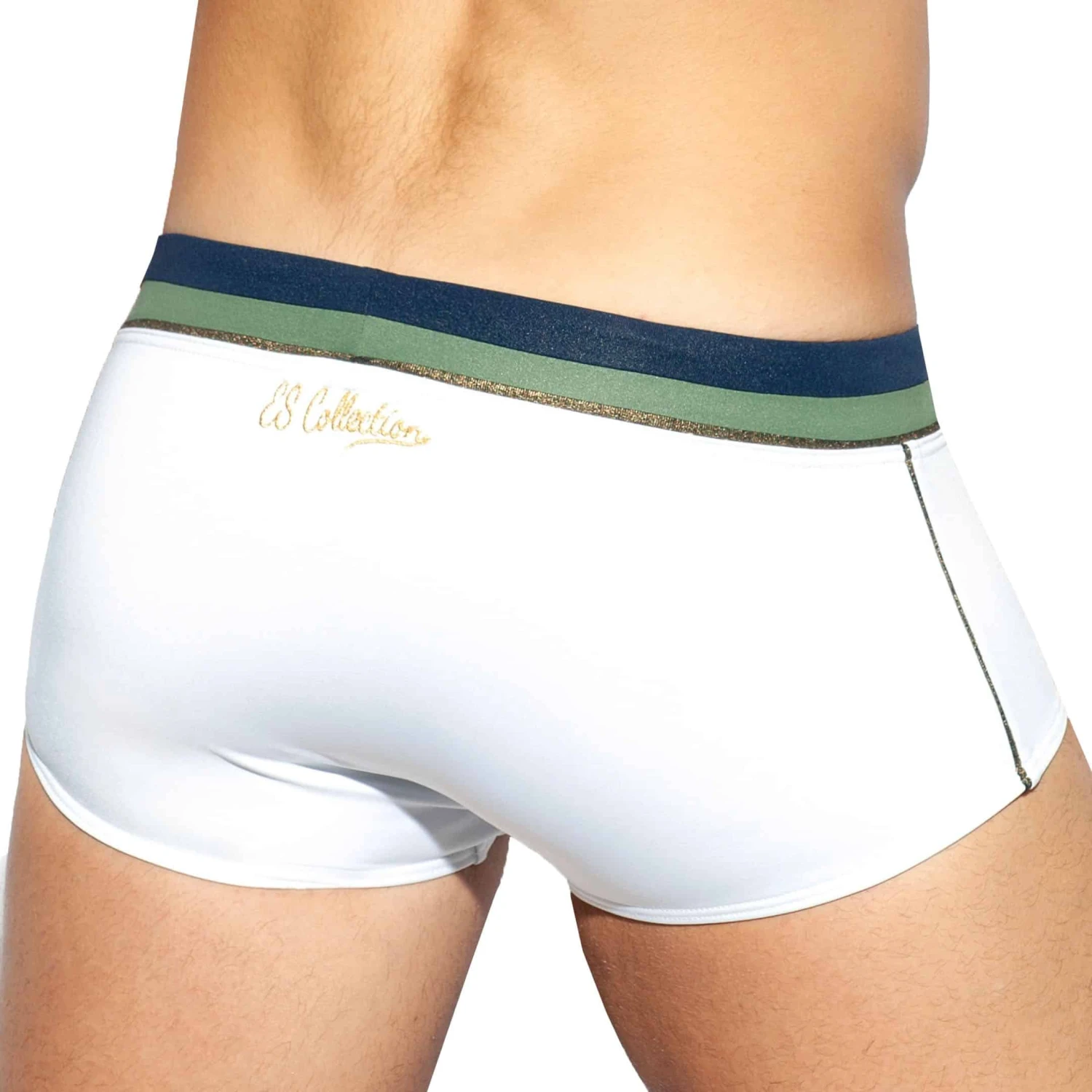 Boxer de bain taille basse, sexy et ajusté, en microfibre douce et confortable. Système Pack Up amovible. Logo ES Collection brodé sur la cuisse gauche et à l’arrière. Ceinture élastique bicolore avec cordon de serrage. Détails de couleur contrastée.