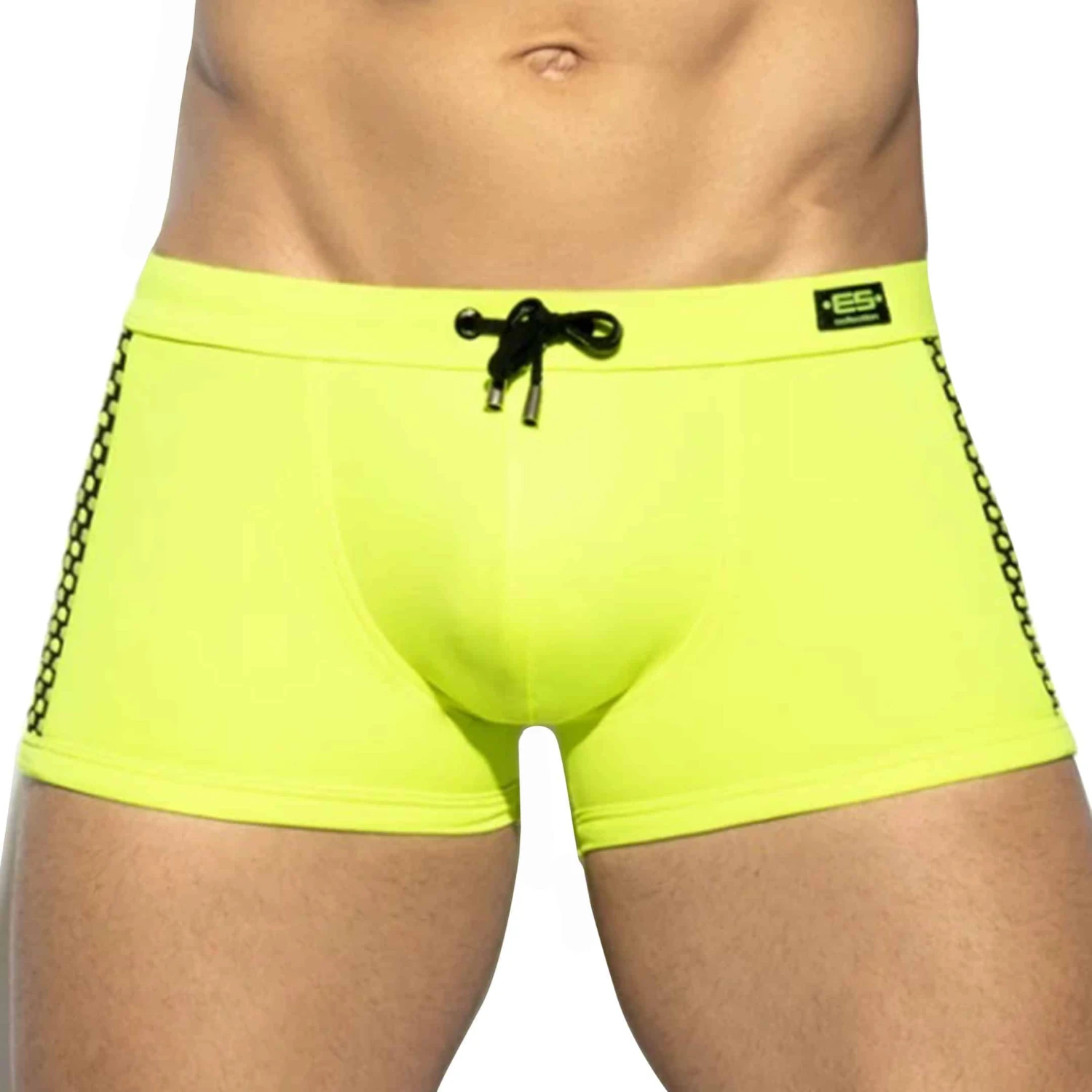 Boxer de bain en microfibre résistante et confortable. Tissu jacquard à motif contrasté sur les côtés. Système Pack-Up intégré avec mousse amovible pour mettre en valeur votre masculinité. ÉtiquetteES Collection en silicone sur hanche gauche. Poche arrière. Ceinture élastique avec cordon de serrage.
