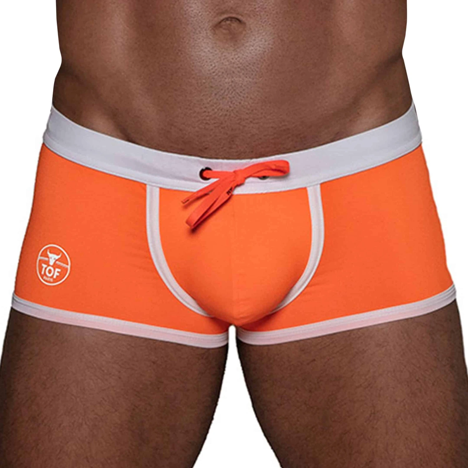 Boxer de bain en microfibre extensible et légère de couleur fluo. Tissu résistant au chlore et à l’eau de mer. Coupe taille basse, courte et ajustée, sans couture sur les côtés ni sur les fesses. Bordures de couleur contrastée. Grande poche frontale doublée. Ceinture élastique avec cordon de serrage. Logo TOF Paris imprimé sur la cuisse droite. Fabrication française.