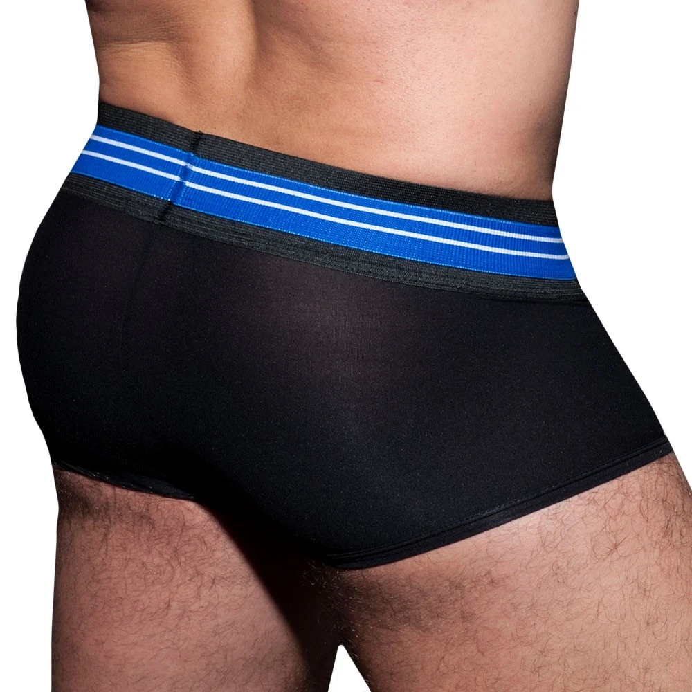 Boxer taille basse en microfibre fine et légère. Poche frontale en mesh respirant de couleur contrastée. Ceinture élastique extra-large décorée d’une double d’une bande rayée et du logo AD Fetish en silicone.