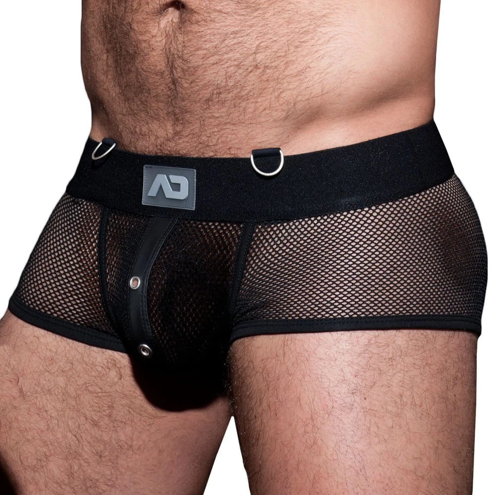 Boxer en mesh transparent, dont le maillage large laisse peu de place à l’imagination. L’arrière a été découpée, comme sur un jockstrap, pour une totale liberté de mouvement. Empiècements en microfibre imitant le latex. Poche frontale non doublée. Large ceinture élastique dotée de 3 anneaux métalliques. Logo AD Fetish en silicone.
