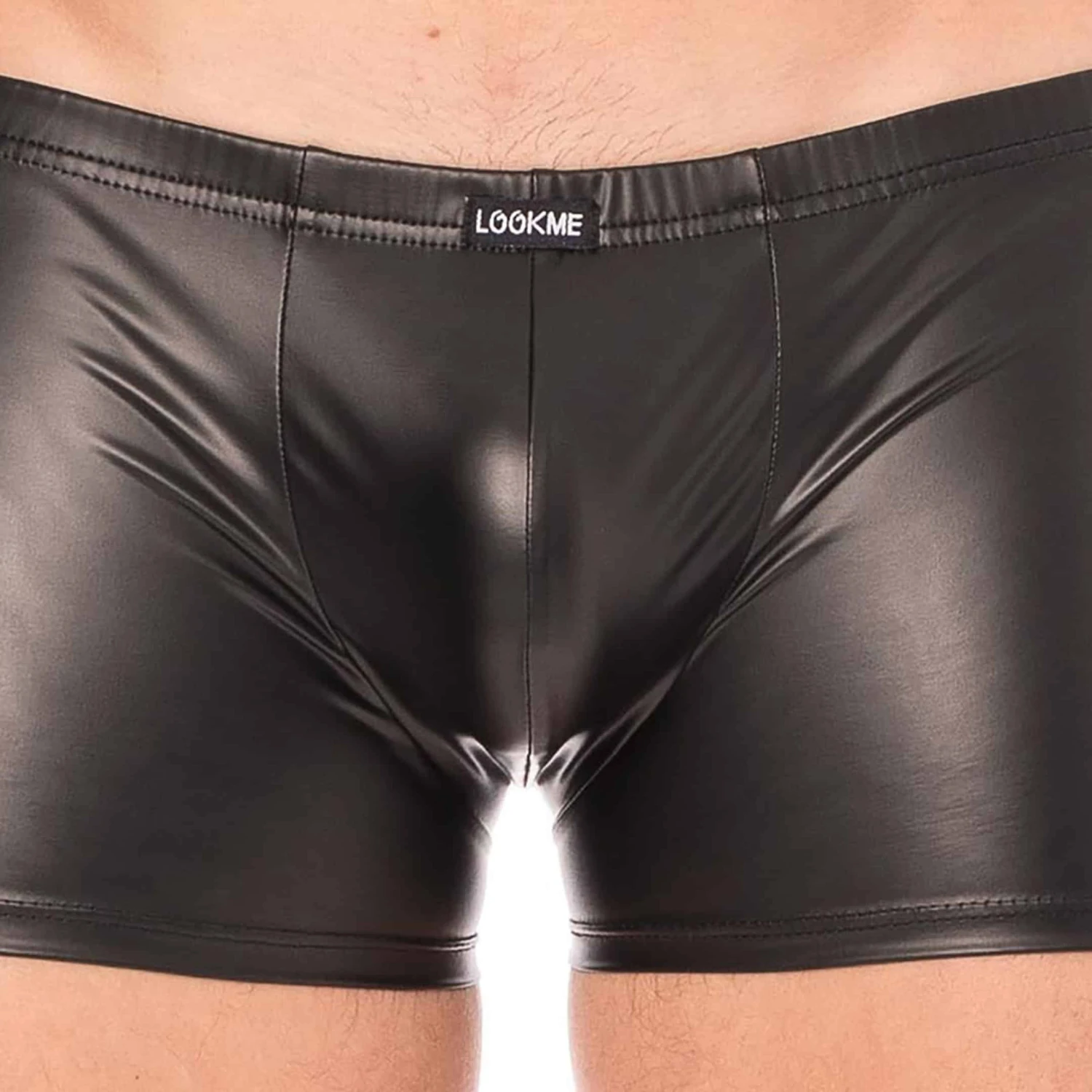 Boxer sexy et provocant en simili cuir extensible, souple et confortable. Coupe taille basse et ajustée. Non doublé. Fine ceinture élastique.