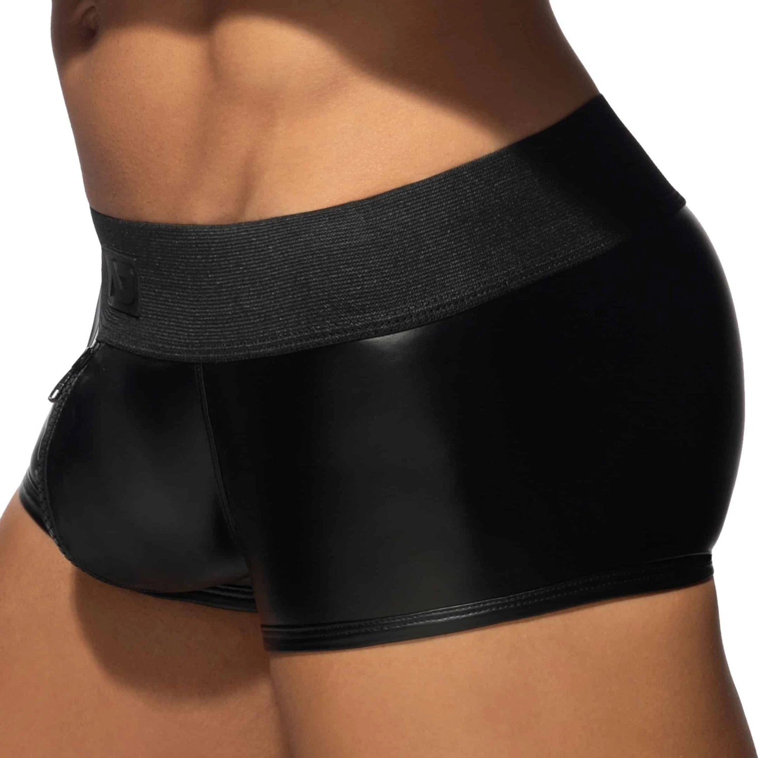 Boxer innovant en microfibre brillante imitant le caoutchouc, pour un look très fetish. Fermetures Eclair fonctionnelles devant et derrière. Technologie RingUp intégrant un anneau cock ring en silicone (diamètre 5 cm, amovible par bouton pression) pour une érection plus dure et plus longue. Ceinture élastique extra-large signée du logo AD en silicone.