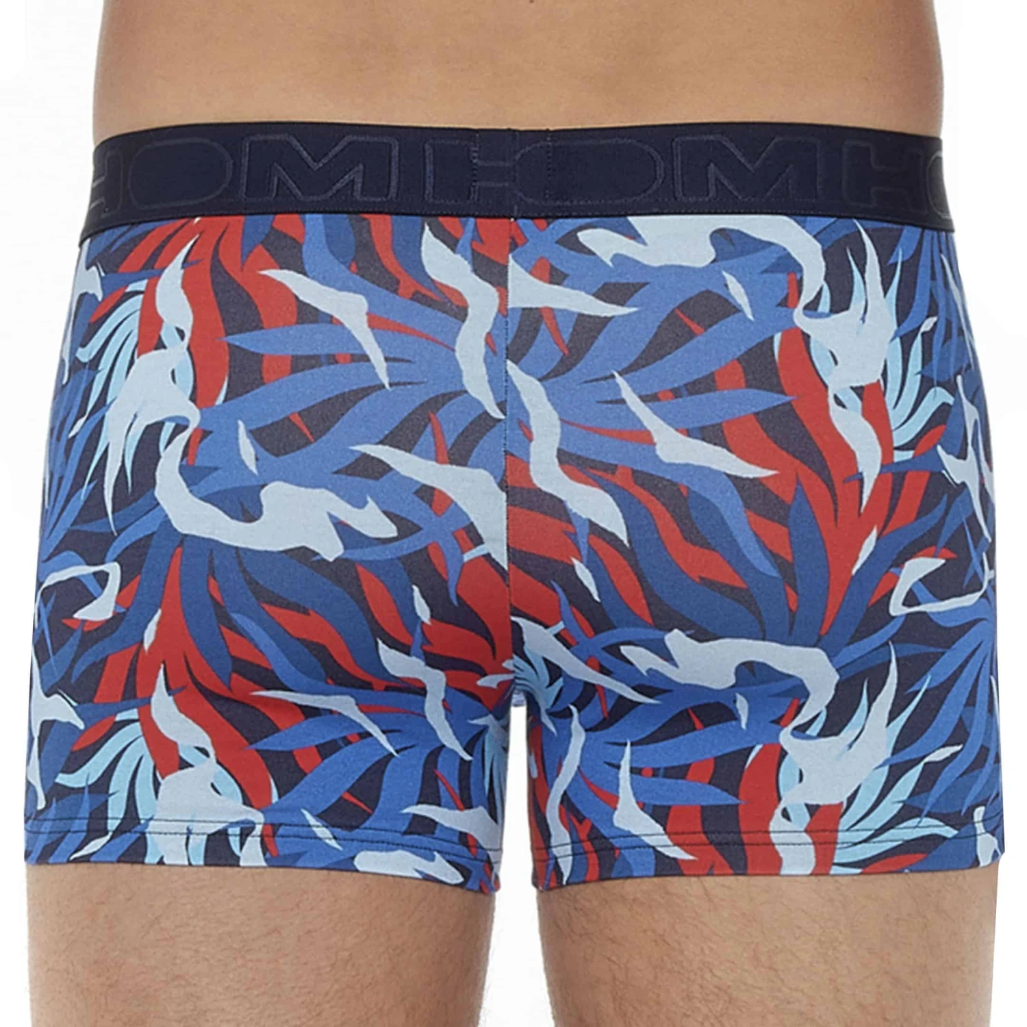 Boxer en mélange de coton et de modal doux et confortable. Imprimé camouflage revisité avec de larges feuilles entrelacées. Tissu de qualité supérieure certifié Oeko-Tex. Poche frontale doublée. Ceinture élastique signée HOM.