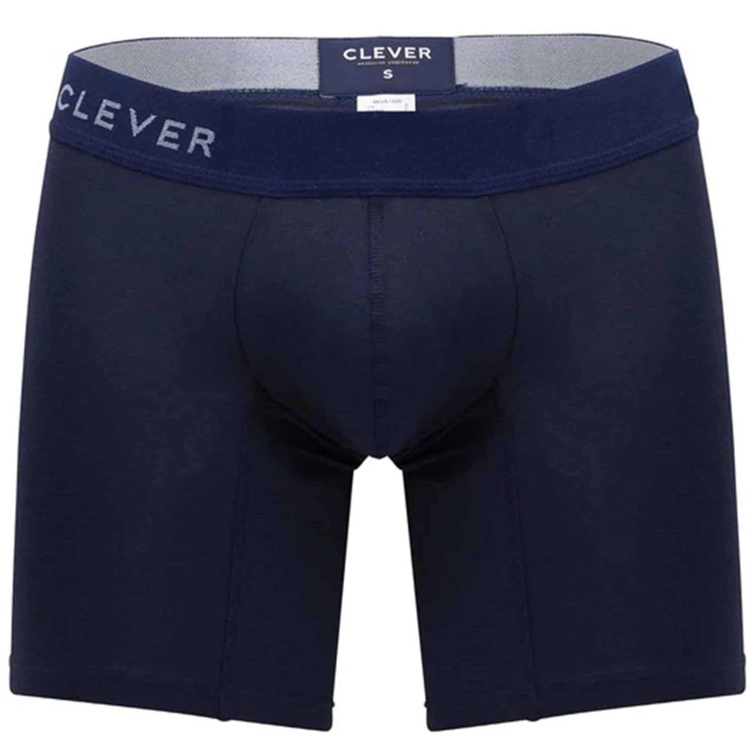 Boxer long très ajusté en coton extensible de couleur unie. Poche frontale anatomique enveloppant naturellement votre intimité, pour un maintien très agréable et sensuel. Ceinture élastique signée Clever.