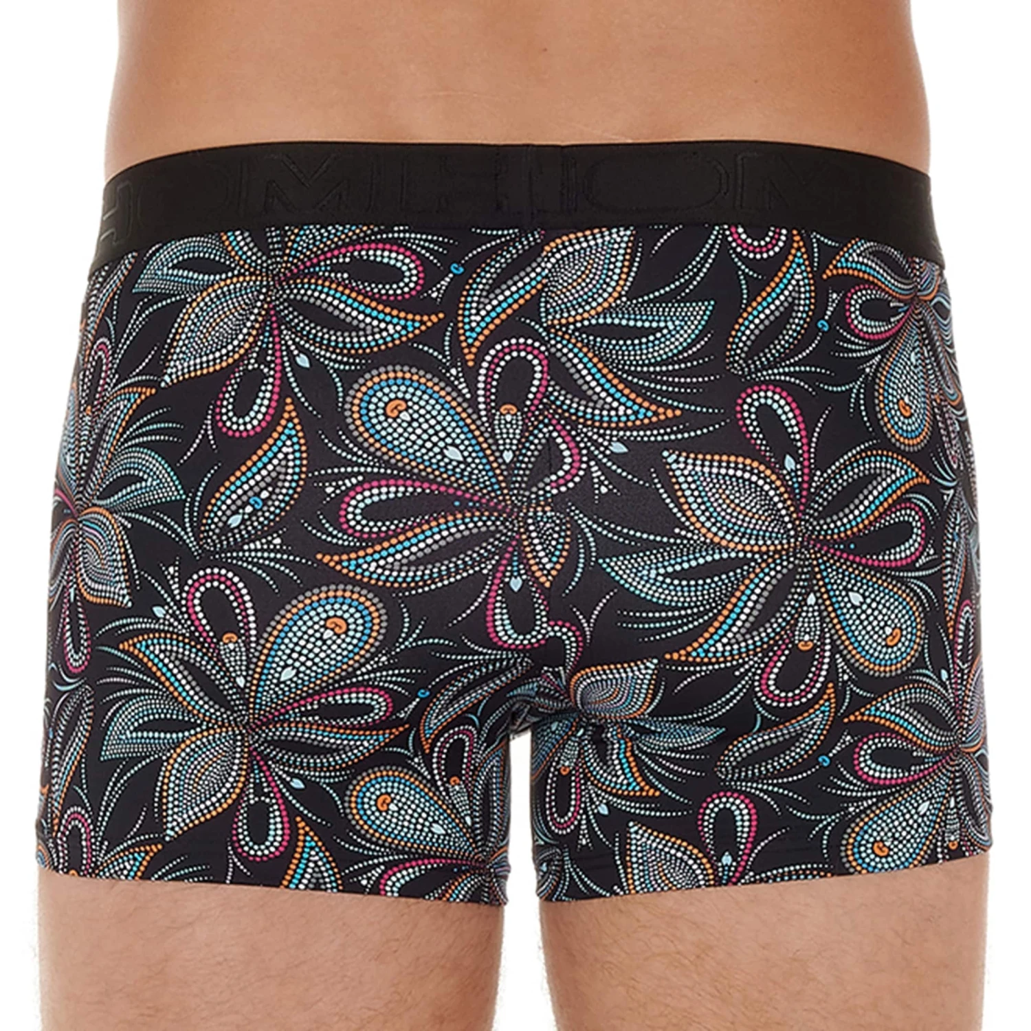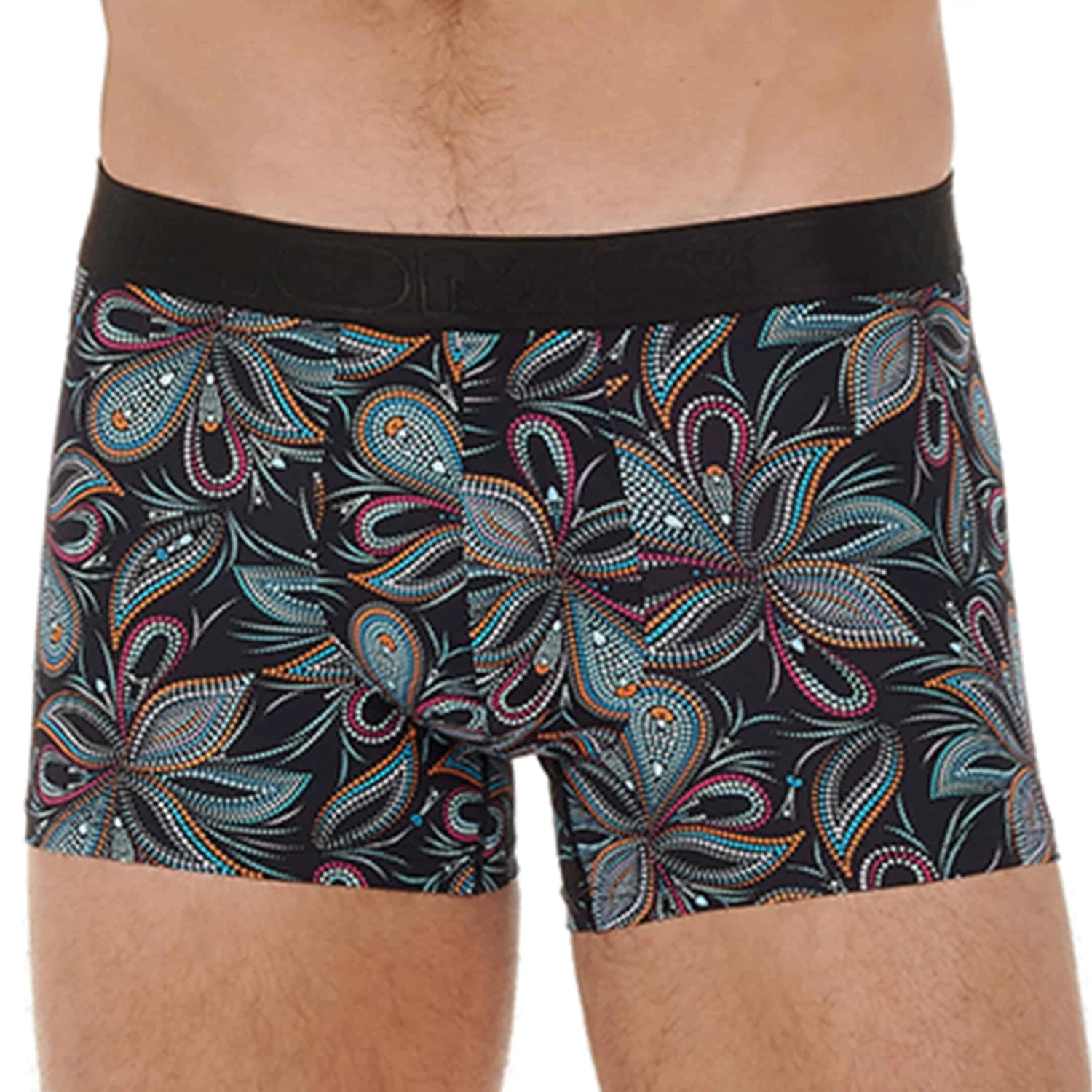 Boxer en microfibre extensible, douce et confortable. Tissu de qualité supérieure certifié Oeko-Tex. Imprimé floral exotique sur un fond noir. Poche frontale doublée. Ceinture élastique signée HOM.
