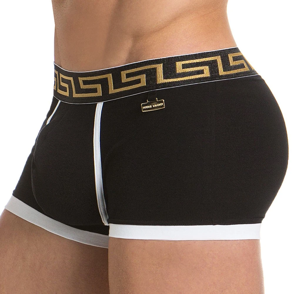 Boxer taille basse en coton doux. Poche frontale doublée pour plus de confort. Plaque métallique dorée signée Modus Vivendi sur la hanche gauche. Motif inspiré par la Grèce antique sur la ceinture élastique.