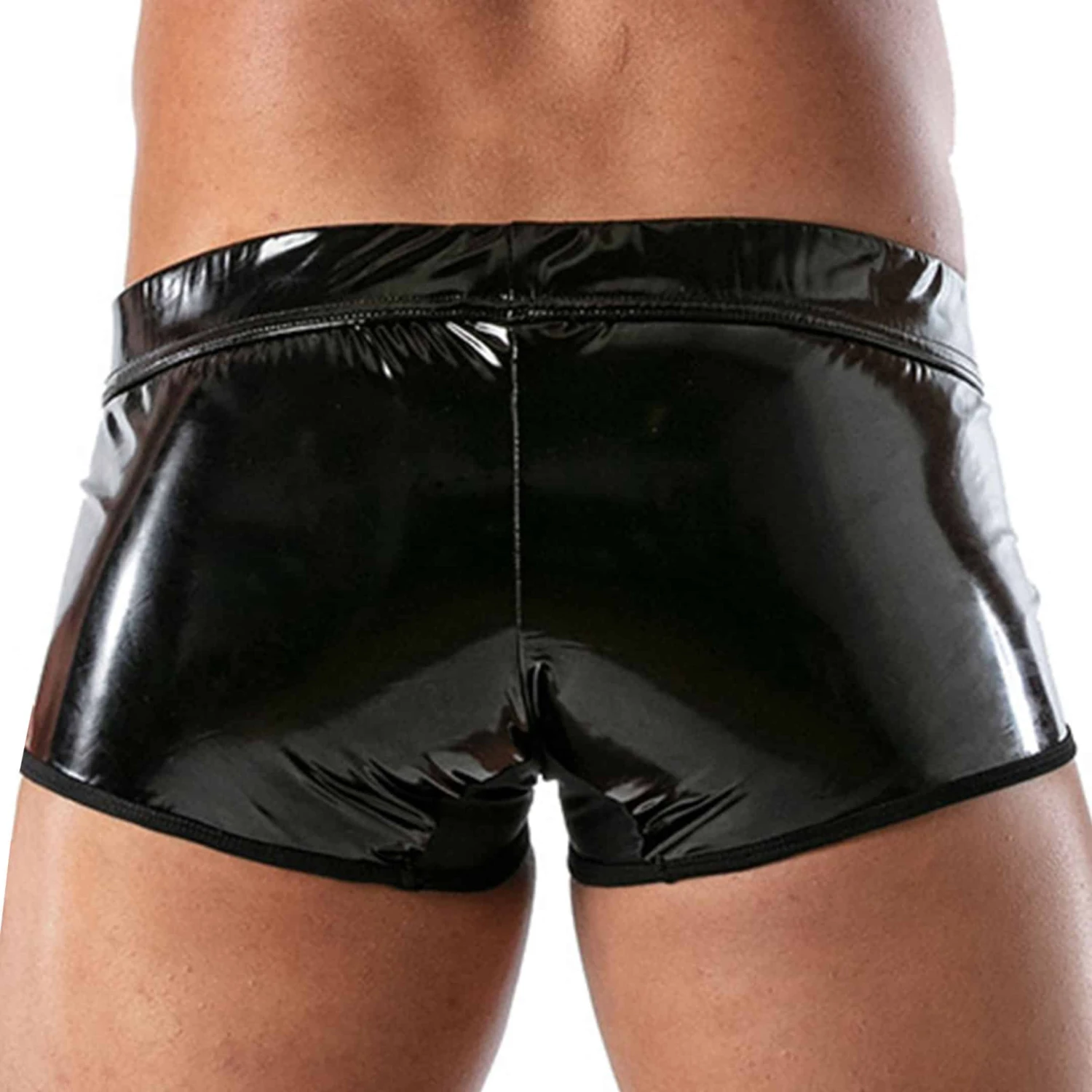Boxer taille basse en microfibre stretch imitant le cuir ciré, pour un look très fetish. Ecusson TOF Paris en silicone sur la ceinture élastique recouverte. Fabrication française.