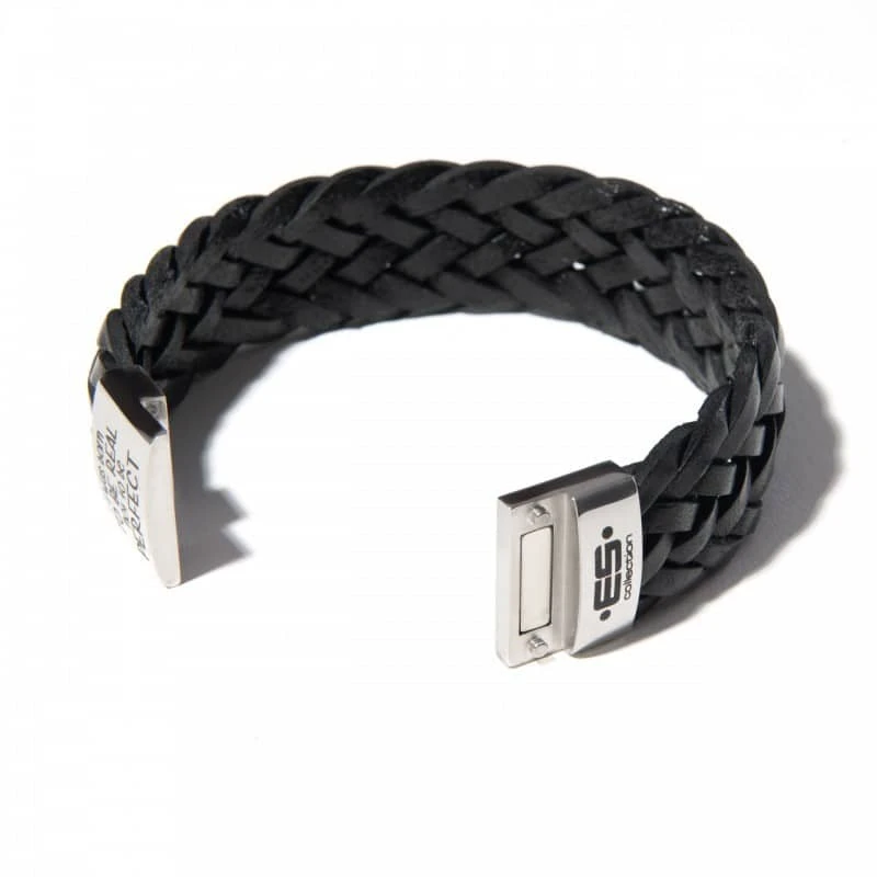 Bracelet élégant en cuir tressé. Fermoir métallique magnétique. Inscription « I was born to be real not to be perfect » (« Je suis né pour être réel, pas pour être parfait »). Pochette signée ES Collection. Disponible en deux tailles : S/M 18 cm et L/XL 20 cm. Ne pas plonger dans l’eau.