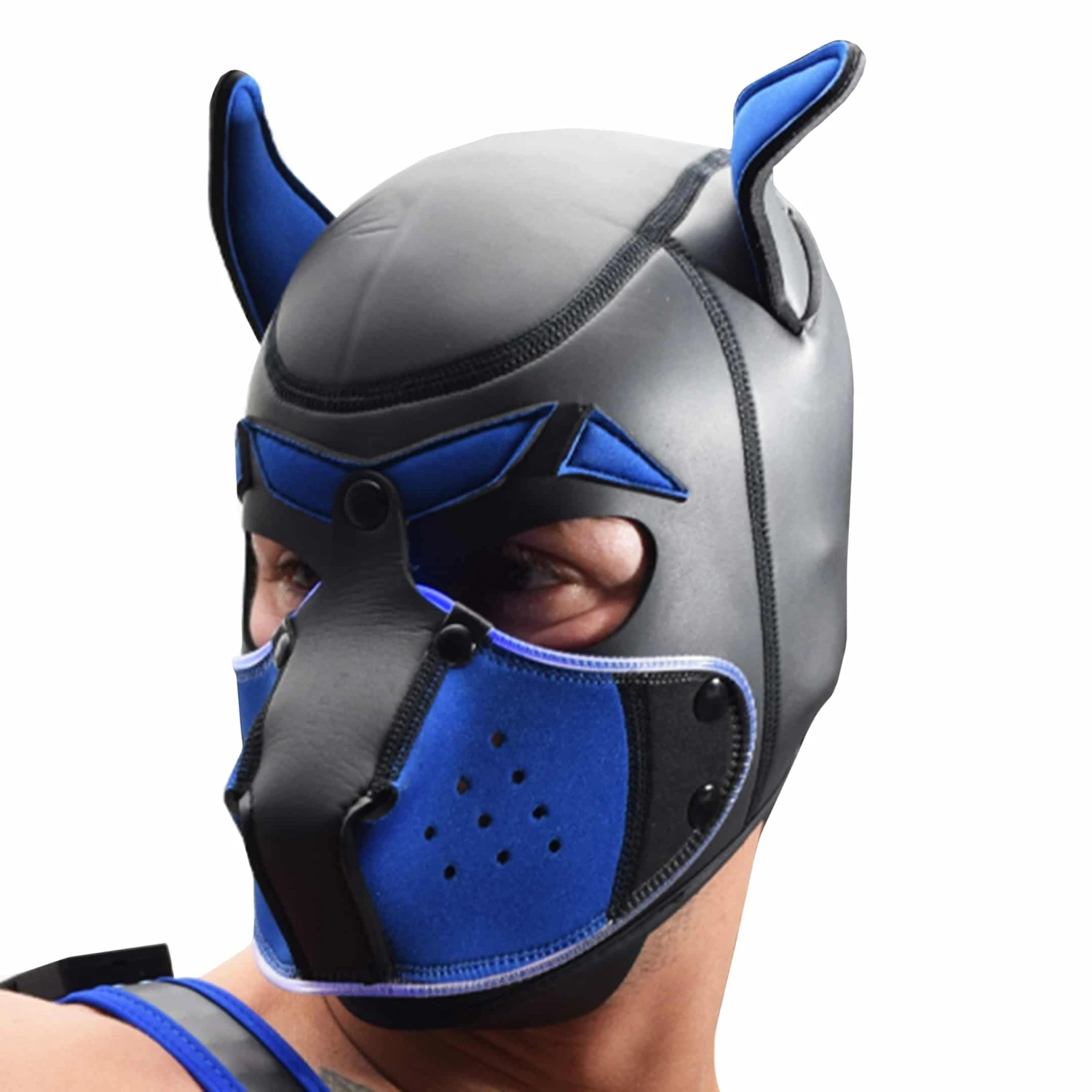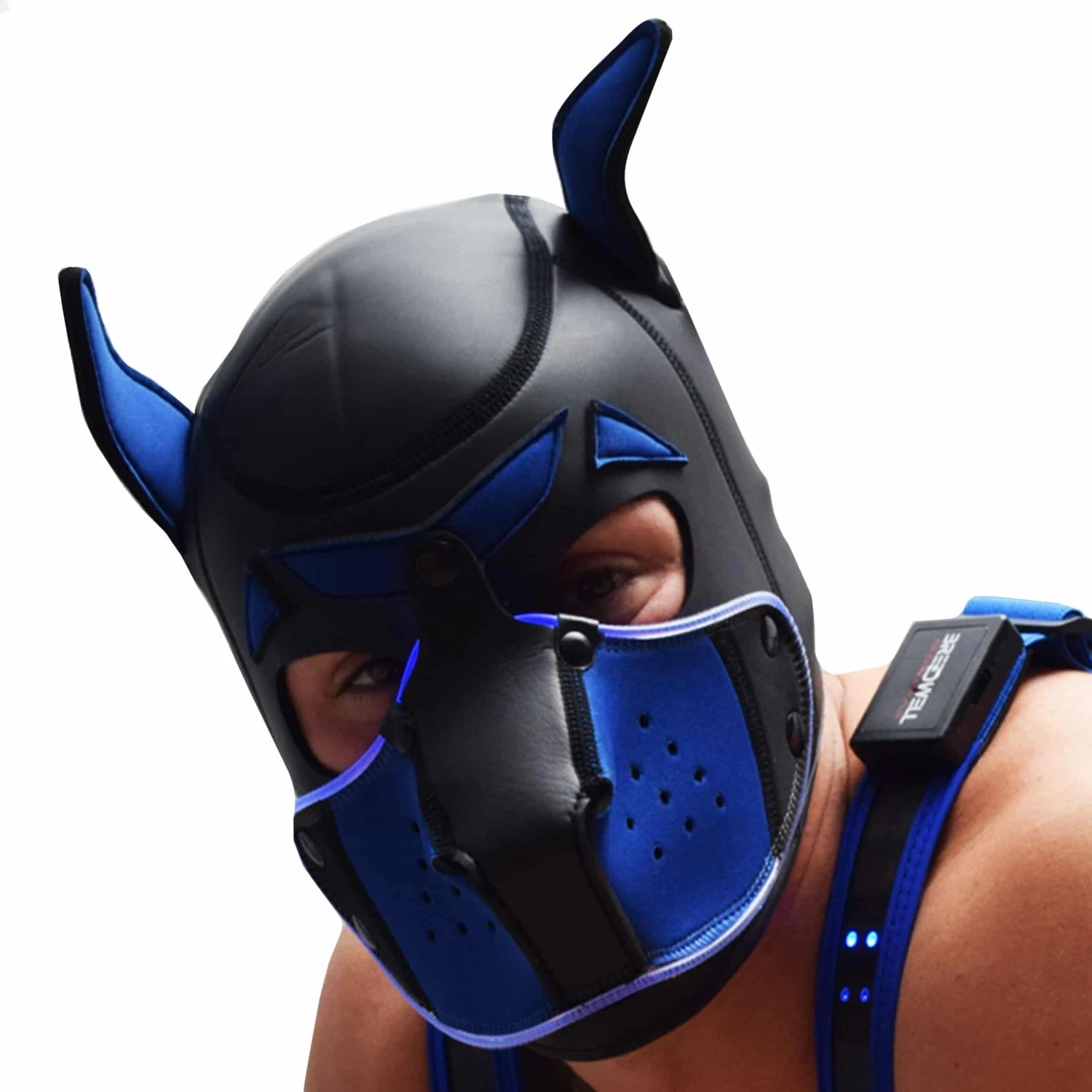 Masque de chien intégral en néoprène caoutchouté, pour s’adonner à de jeux de rôle très fetish. Museau respirant amovible par boutons-pression. Lumières LED intégrées avec modes fixe et clignotant. Sourcils fendus et oreilles souples. Anneau métallique en D et logo Breedwell à l’arrière de la tête. Livré avec un câble de chargement USB. Taille S/M pour un tour de tête (mesuré au niveau des sourcils) de 56 à 58 cm. Taille L/XL pour un tour de tête de 59 à 61 cm.