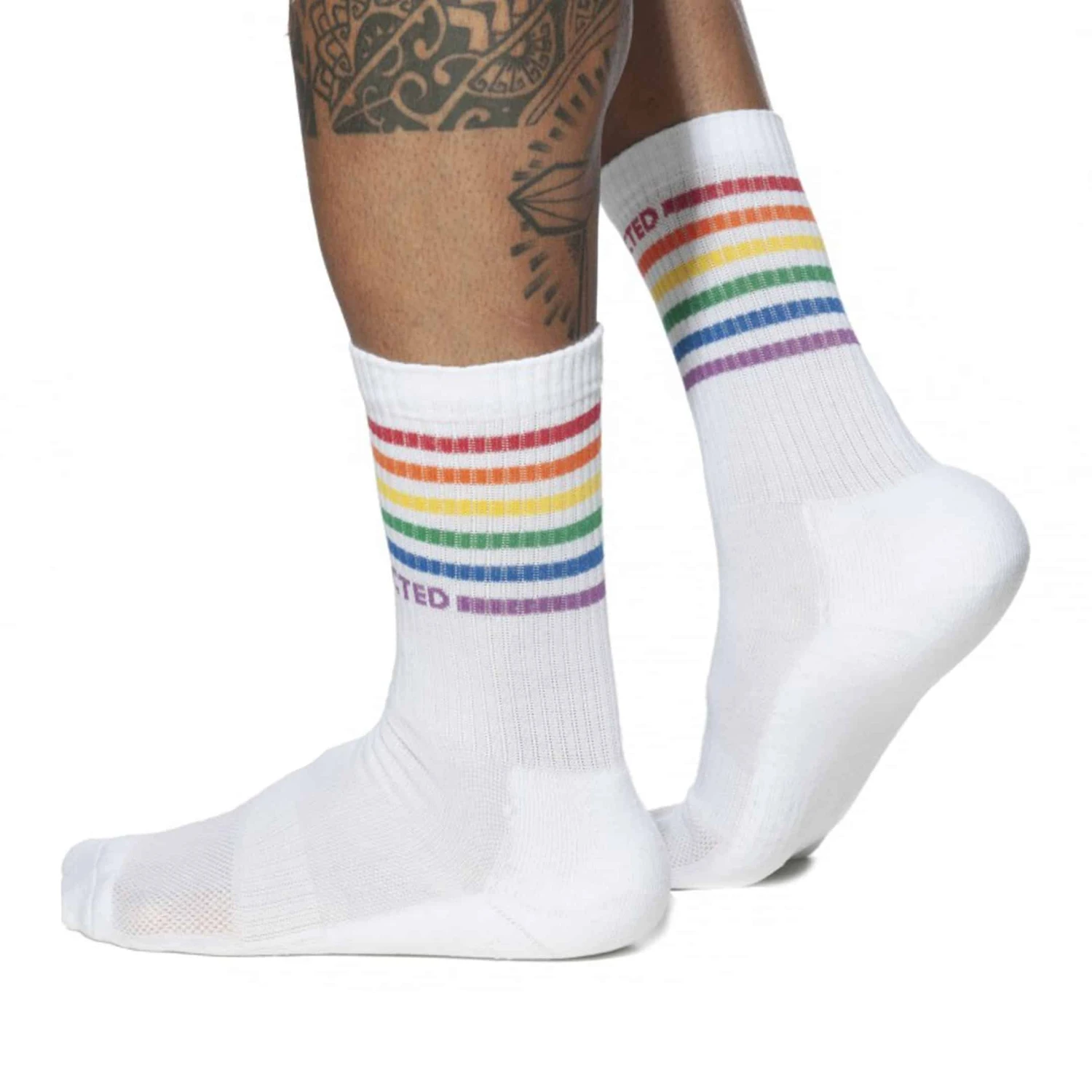 Chaussettes sport mi-mollet en mélange doux et confortable à base de coton. Semelle renforcée avec finition bouclette. Bandes contastées aux couleurs de l’arc-en-cied. Taille S/M : 41-43 , taille L/XL : 44-47.