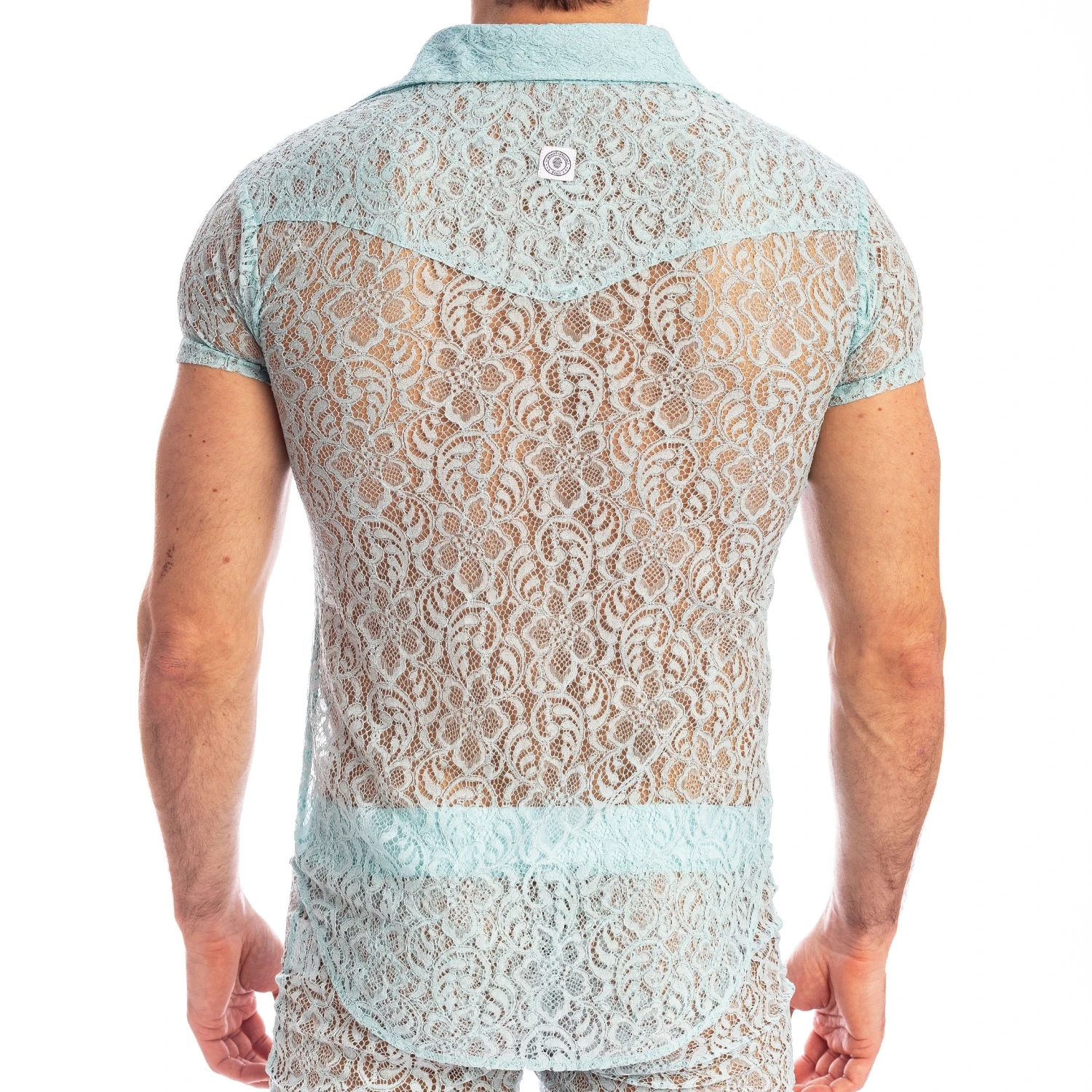 Chemise en dentelle florale transparente de couleur pastel. Coupe cintrée arrondie en bas. Manches courtes. Patte de boutonnage invisible. Logo L’homme Invisible cousu en haut du dos.