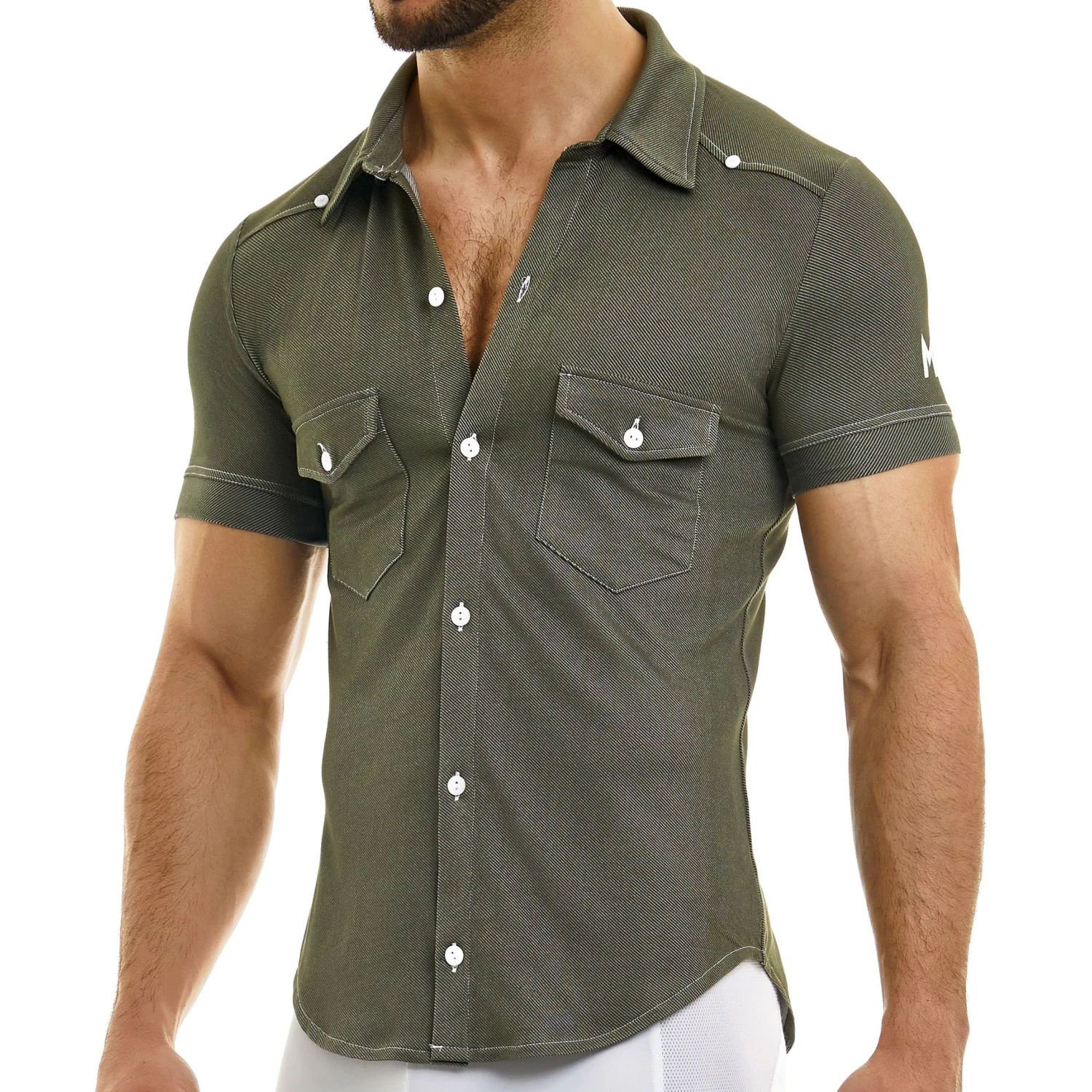 Chemisette cintrée très sexy de couleur unie en mélange de viscose et de microfibre imitant le jeans. Fermeture 6 boutons. 2 poches sur la poitrine. Rivets métalliques signés Modus Vivendi.