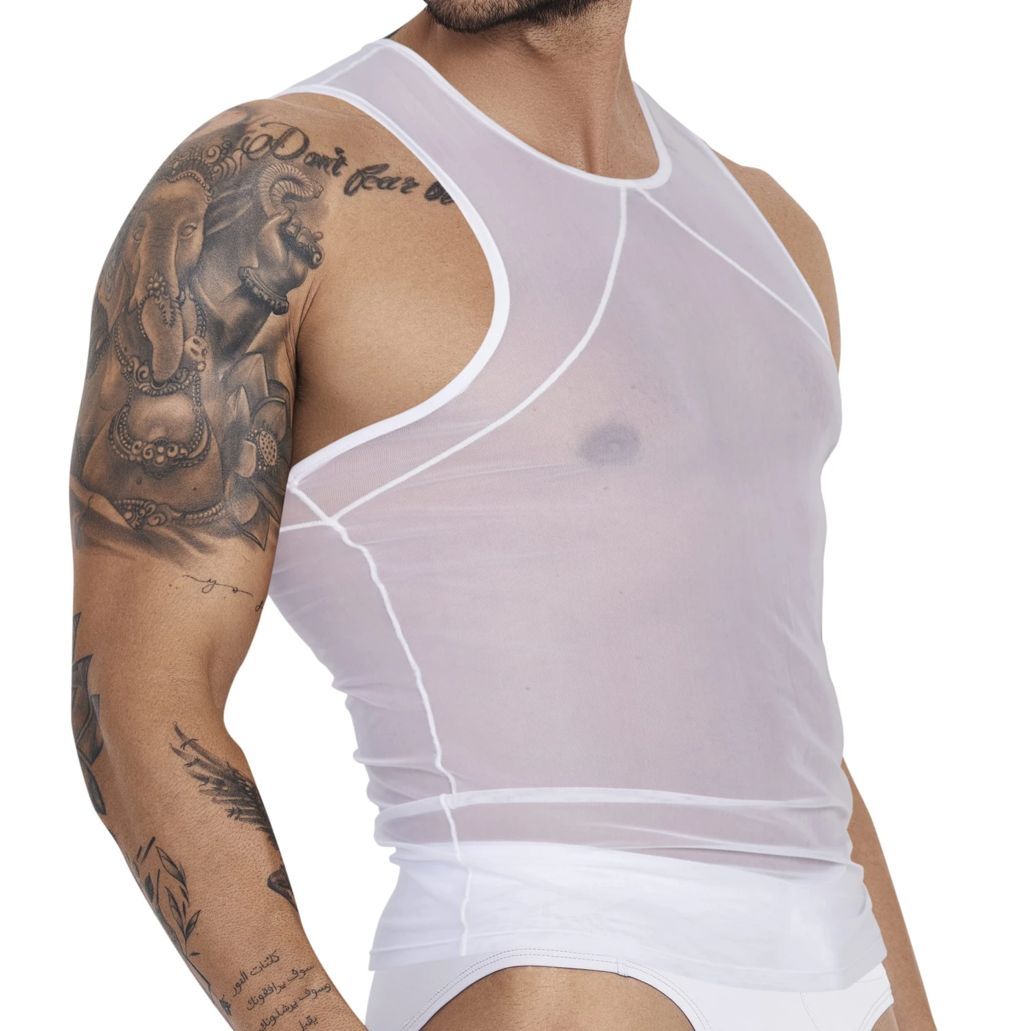 Débardeur très sexy et provocant en résille extensible transparente, douce et légère. Col rond et coupe ajustée. Coutures diagonales sur la poitrine et dans le dos.