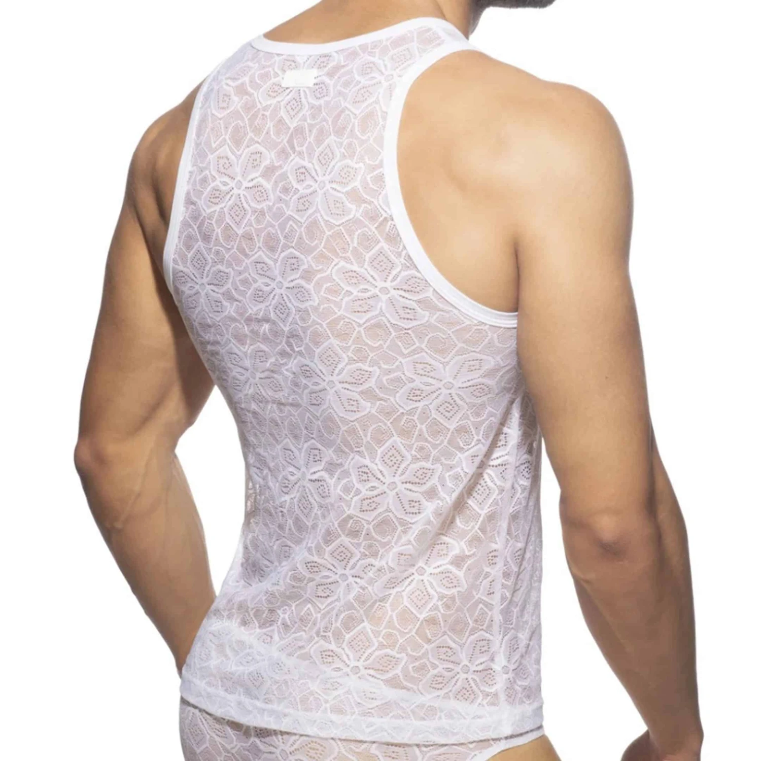 Débardeur sexy en dentelle décorée d’un motif floral. Coupe très ajustée. Logo Addicted en silicone en haut du dos.