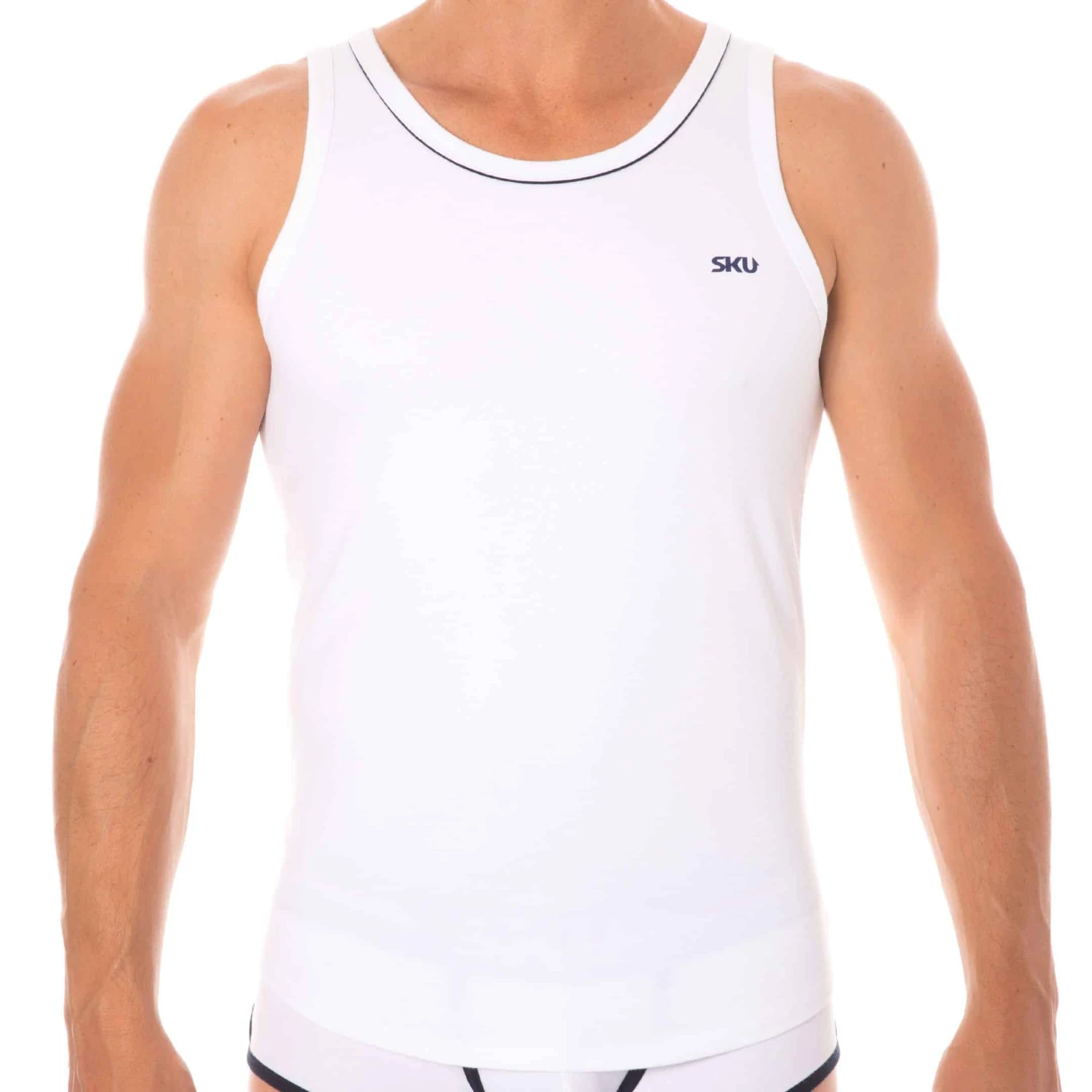 Débardeur sport et sexy en coton premium doux et extensible de couleur intense. Cintré juste comme il faut, il valorisera votre musculature sans gêner vos mouvements. Coupe courte et arrondie en bas, pour tomber parfaitement sur un pantalon. Le col rond est subtilement souligné par un liseré de couleur contrastée. Logo SKU sur la poitrine.