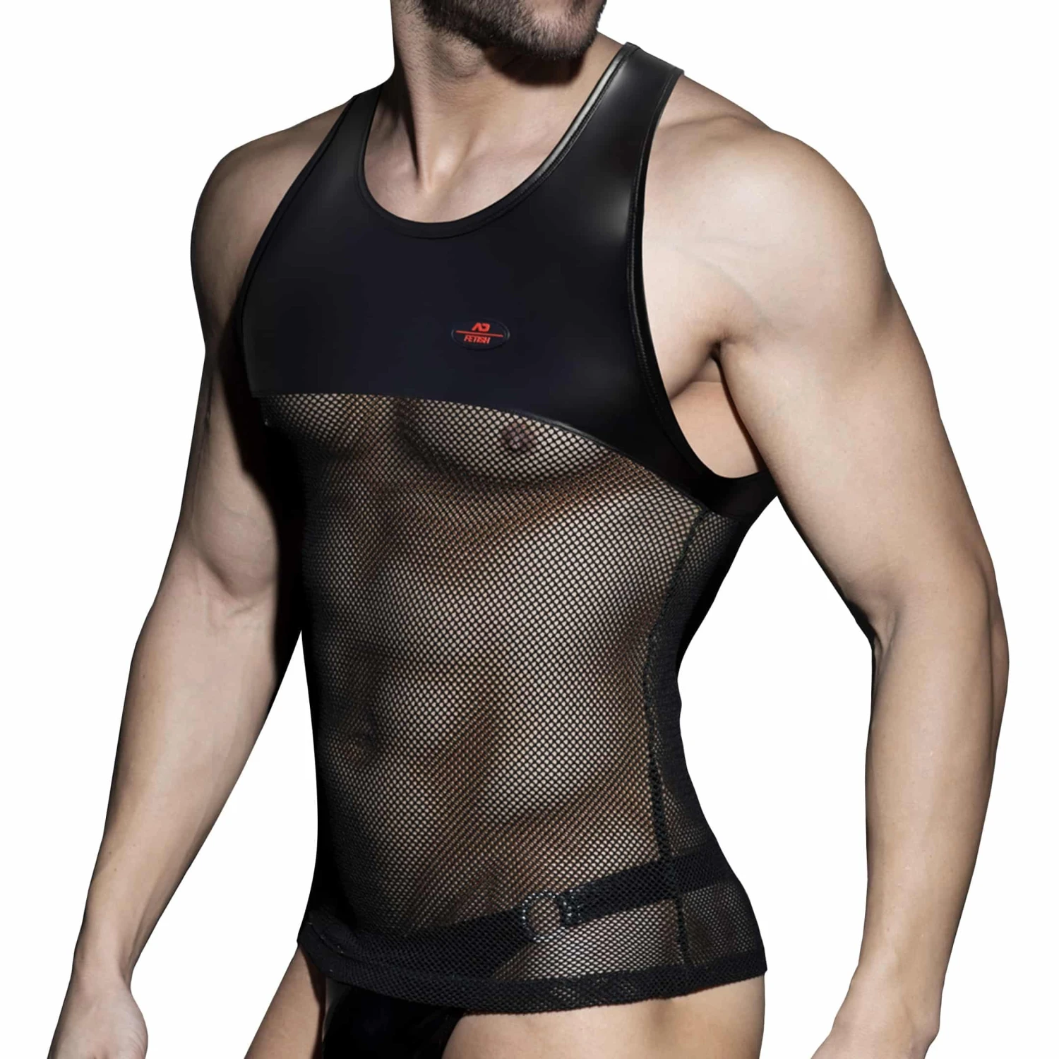 Débardeur sexy en résille à maillage large. Partie supérieure en microfibre brillante imitant le caoutchouc, pour un look très fetish. Logo AD Fetish en silicone sur la poitrine.