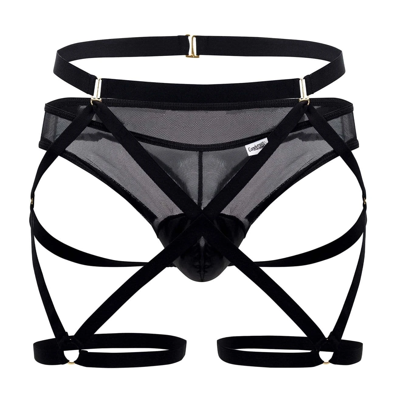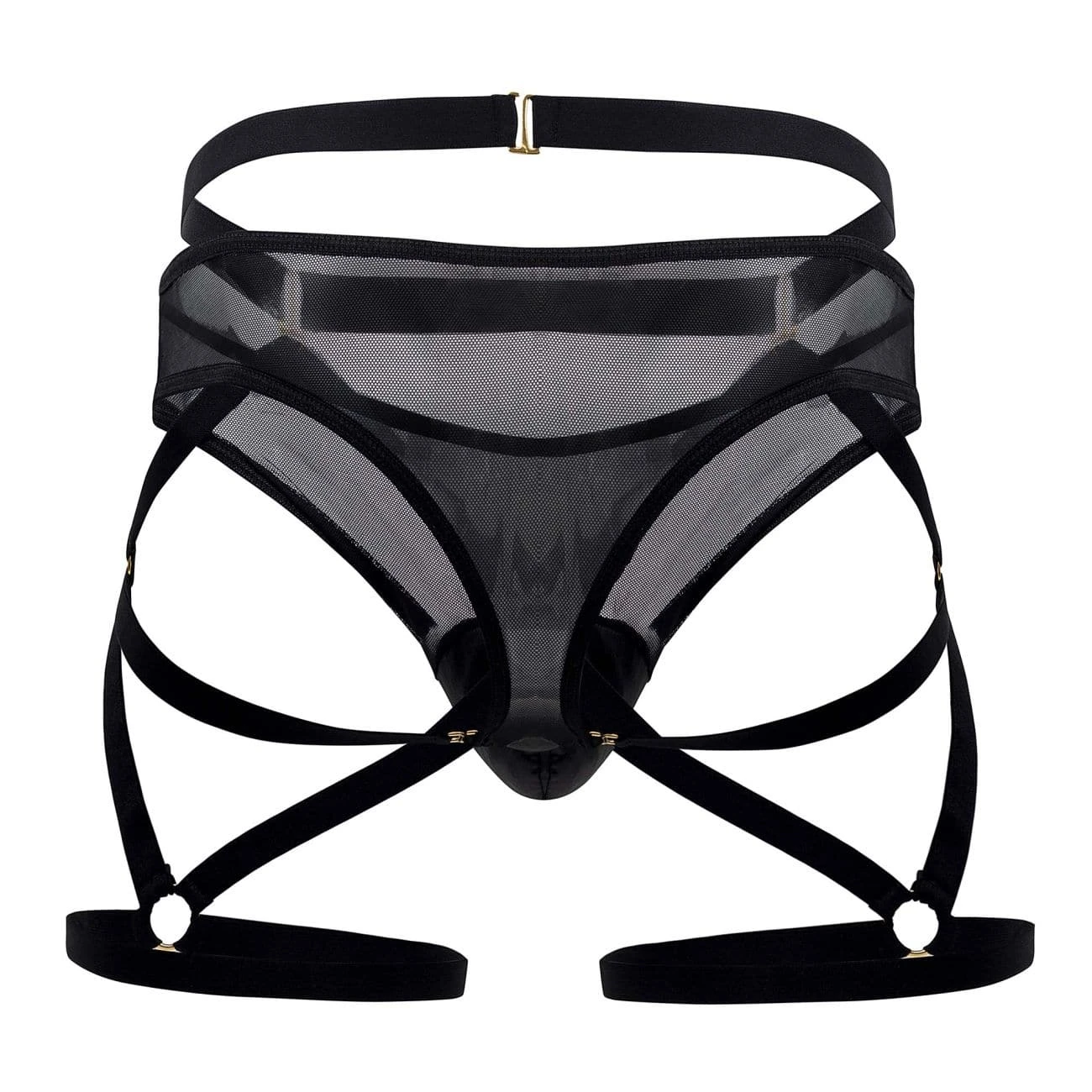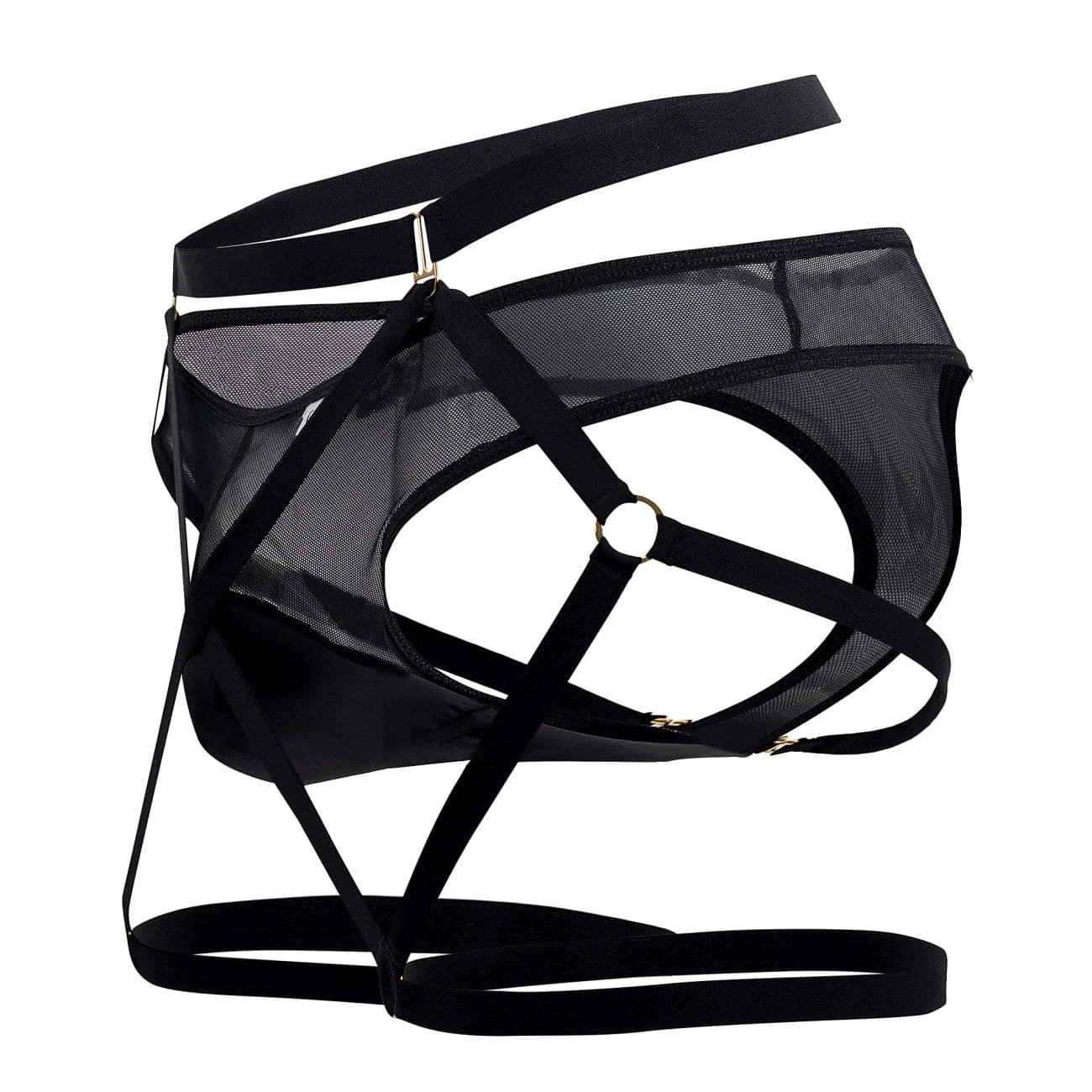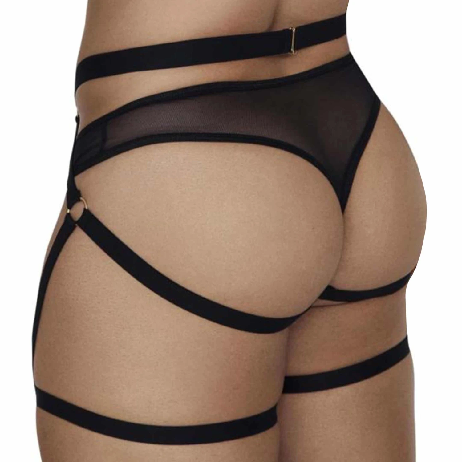 Ensemble très sexy et provocant composé d’un string et d’une jarretière. String en résille transparente avec poche frontale opaque non doublée. Jarretière constituée de bandes élastiques reliées par des anneaux métalliques dorés.