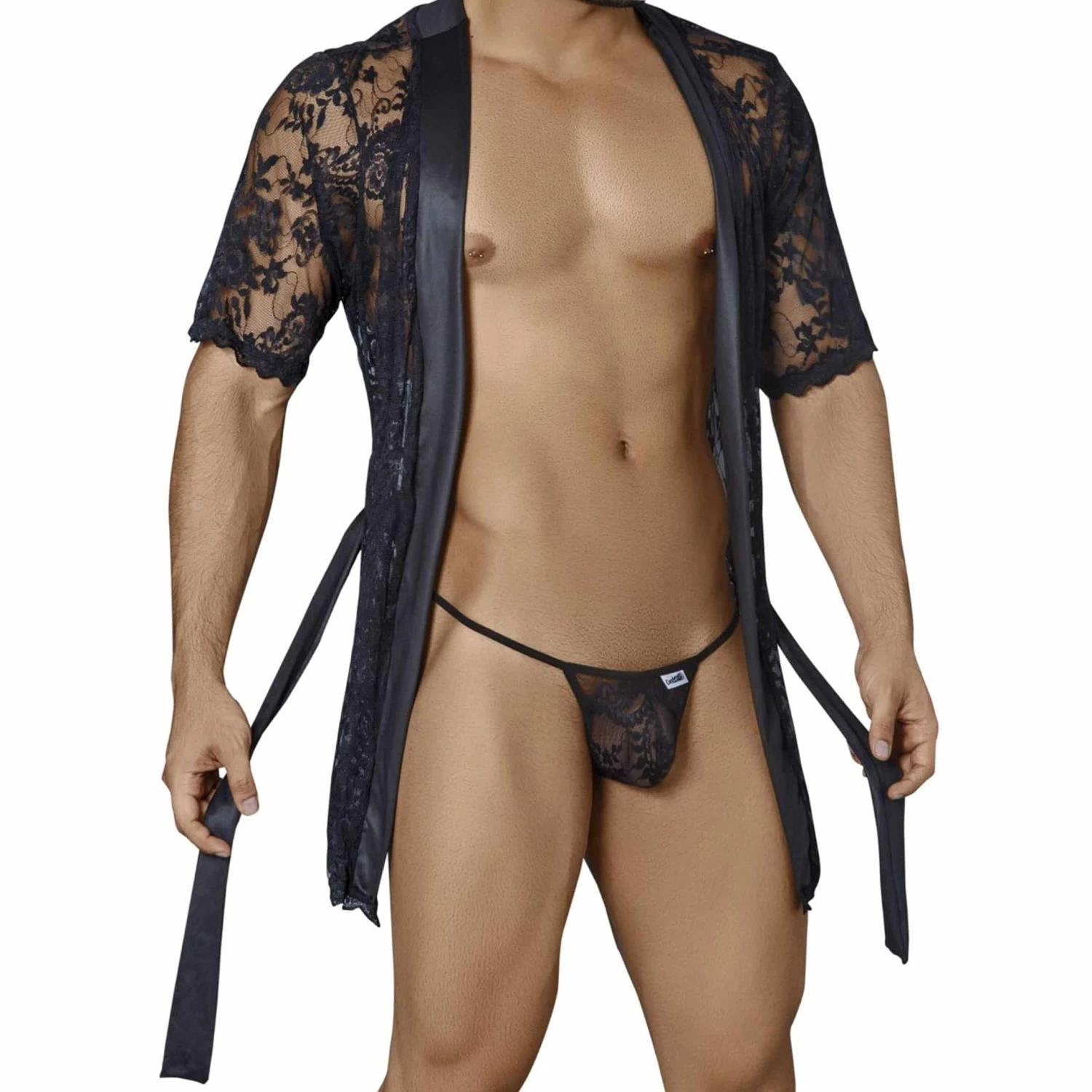 Kimono court et sexy en dentelle fine et légère. Motif floral. Col et ceinture en satin. Vendu avec un string assorti.