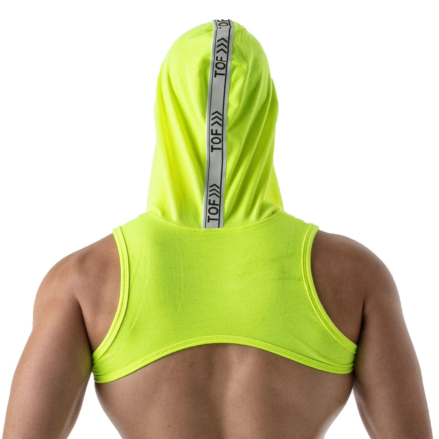 Harnais à capuche en poly-coton molletonné de couleur fluo. Coupe très ajustée pour souligner votre musculature. Bandes réfléchissantes signées TOF. Grande poche à fermeture Eclair. Fabrication française. Short vendu séparément.