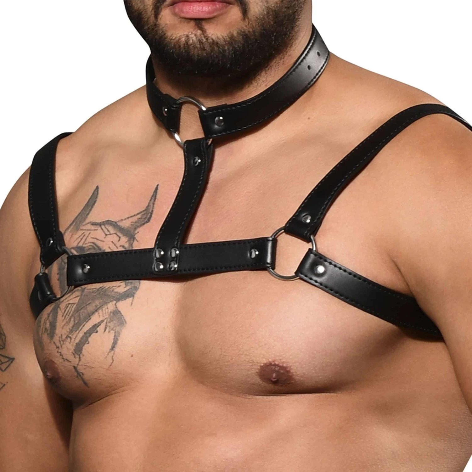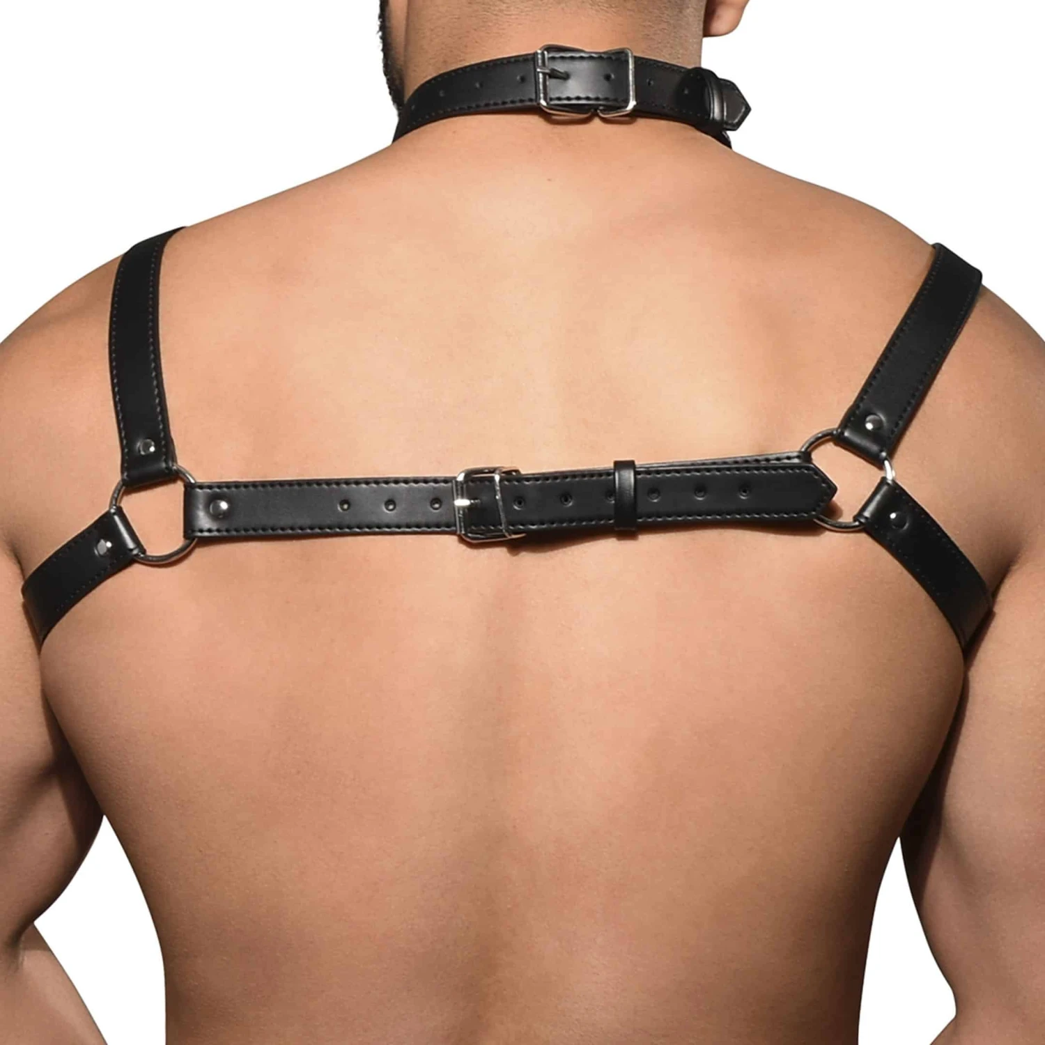 Harnais en simili cuir avec collier de serrage attaché autour du cou. Sangles ajustables reliées par des anneaux métalliques. Taille unique. Édition limitée.