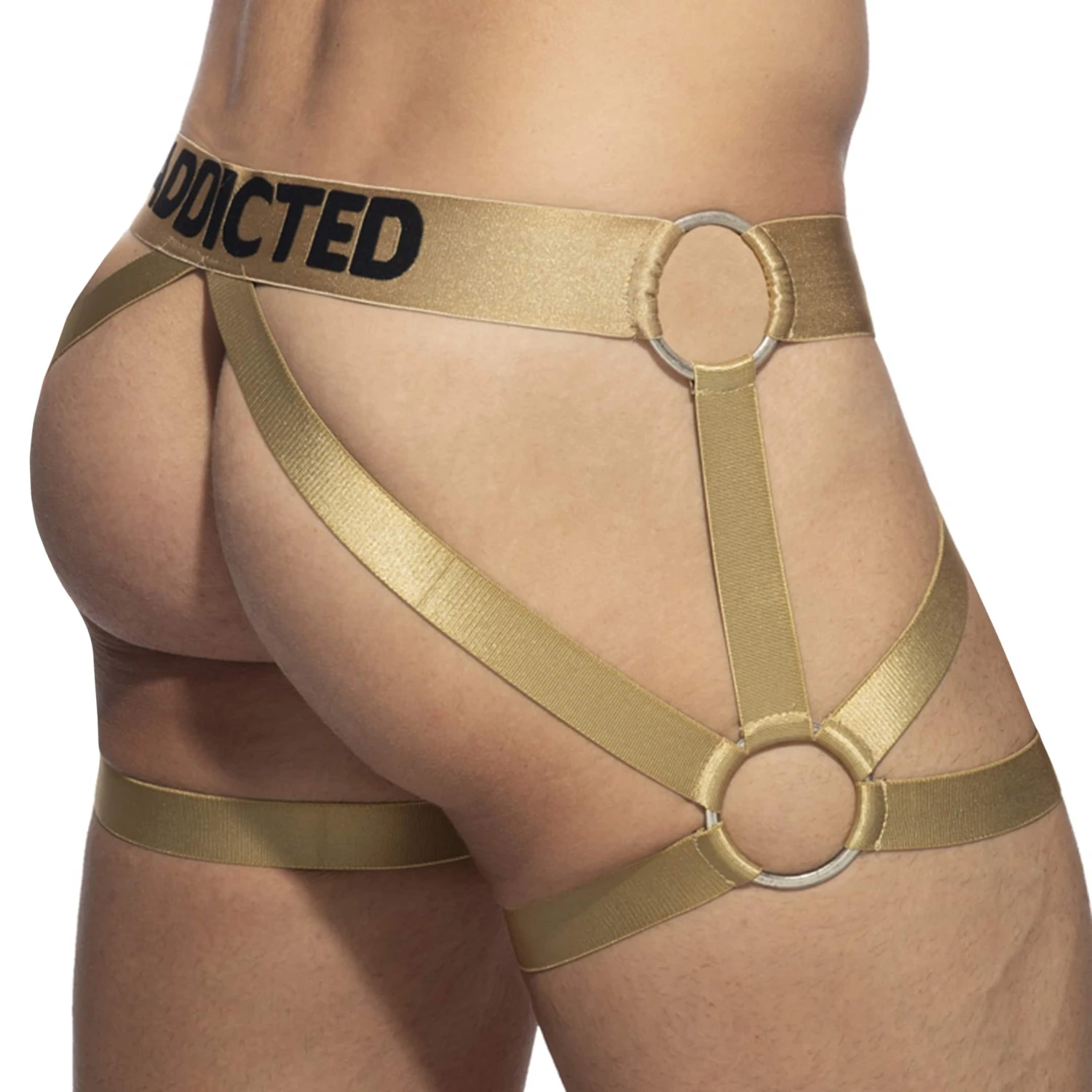 Accessoire masculin très sexy s’inspirant du porte-jarretelles. Constitué de bandes élastiques de couleur métallisée reliées par des anneaux métalliques. Ceinture élastique signée Addicted. Sous-vêtement vendu séparément.