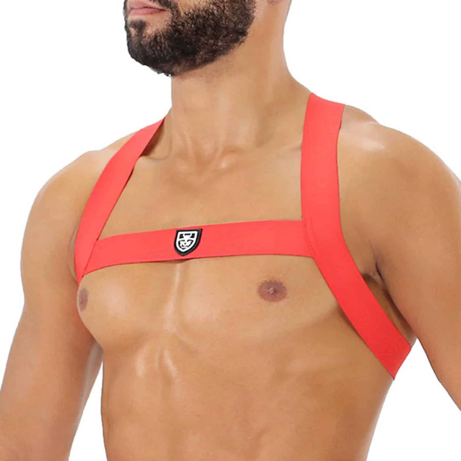 Harnais constitué de bandes elastiques larges de 3,5 cm qui se croisent autour d’un anneau métallique dans le dos. Devant, la forme en H met en valeur vos pectoraux. Ecusson TOF Paris. Fabrication française.