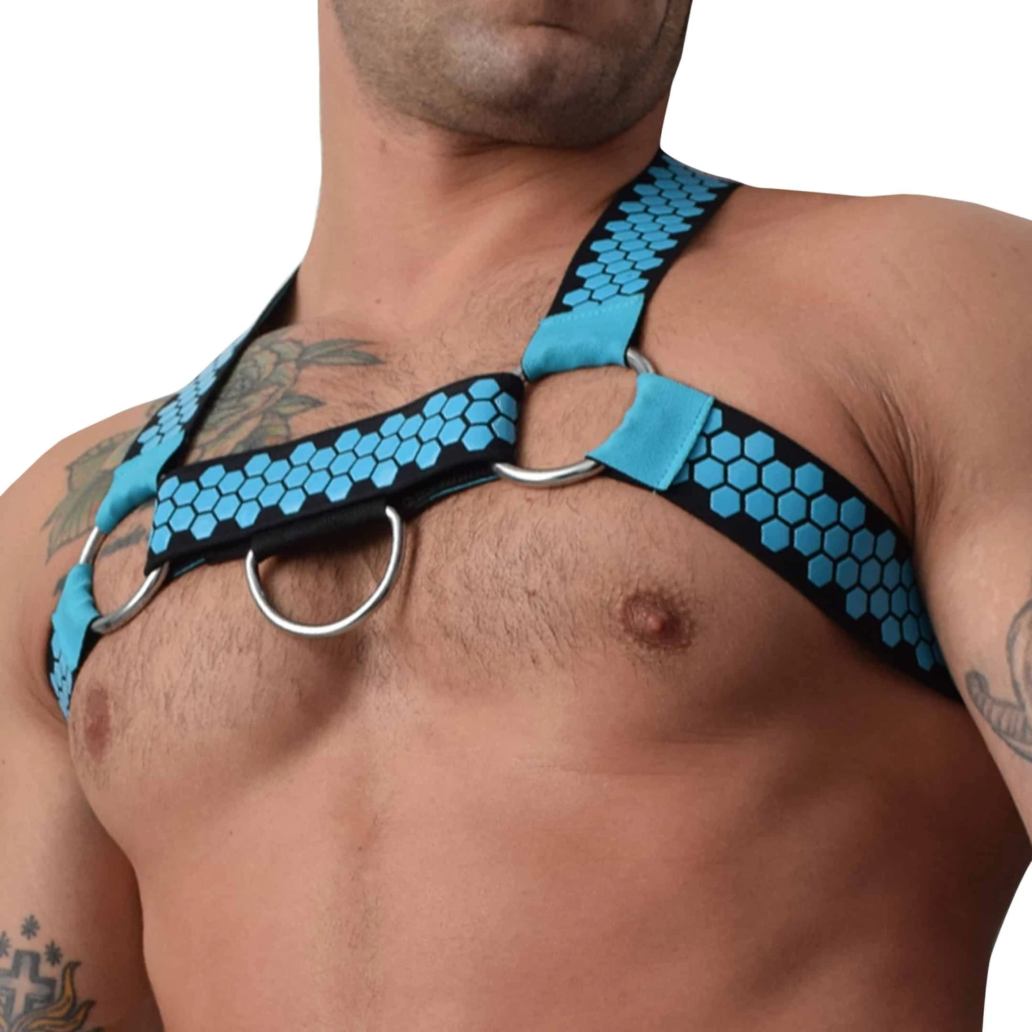 Harnais ultra sexy. Bandes élastiques recouvertes d’hexagones en silicone brillant. 5 anneaux métalliques. Logo Breedwell dans le dos.