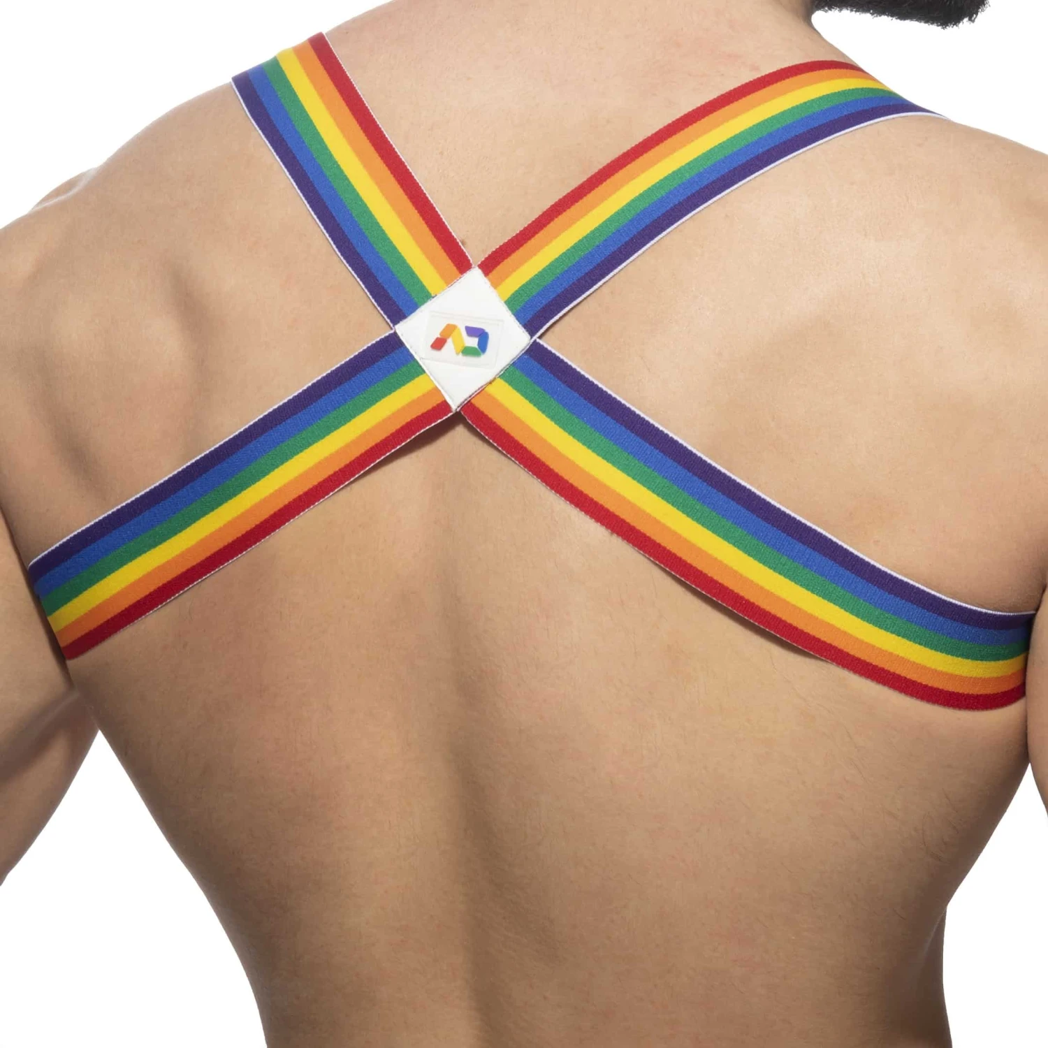 Harnais simple et confortable aux couleurs de l’arc-en-ciel. Les larges bandes élastiques forment un X en haut du dos.