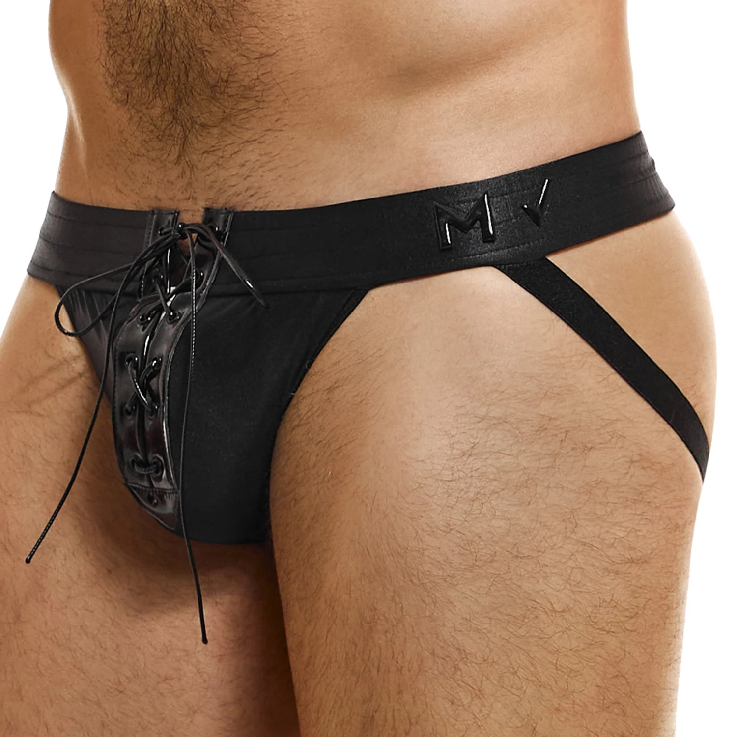 Jockstrap taille basse en microfibre extensible satinée. Braguette en vinyle fermée par un lacet ajustable. Poche frontale non doublée. Ceinture élastique signée MV.
