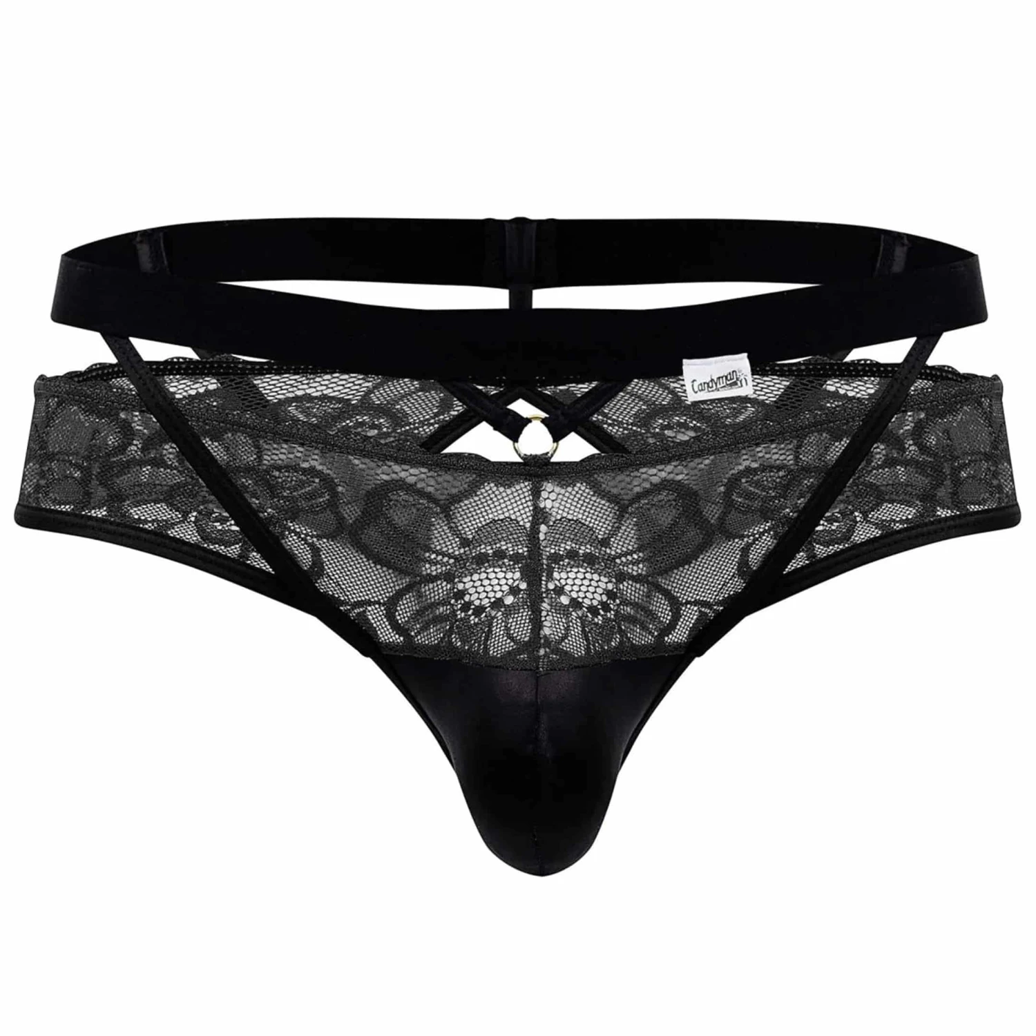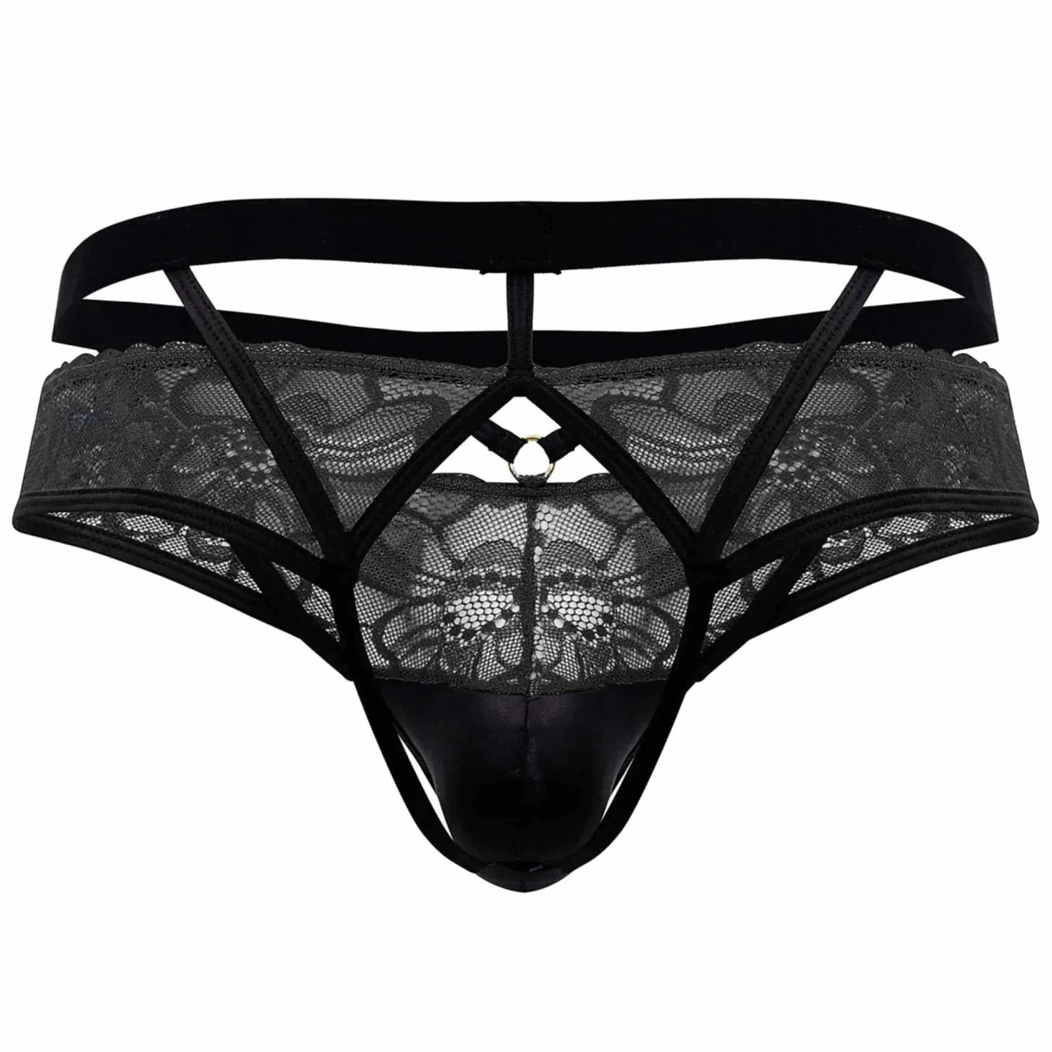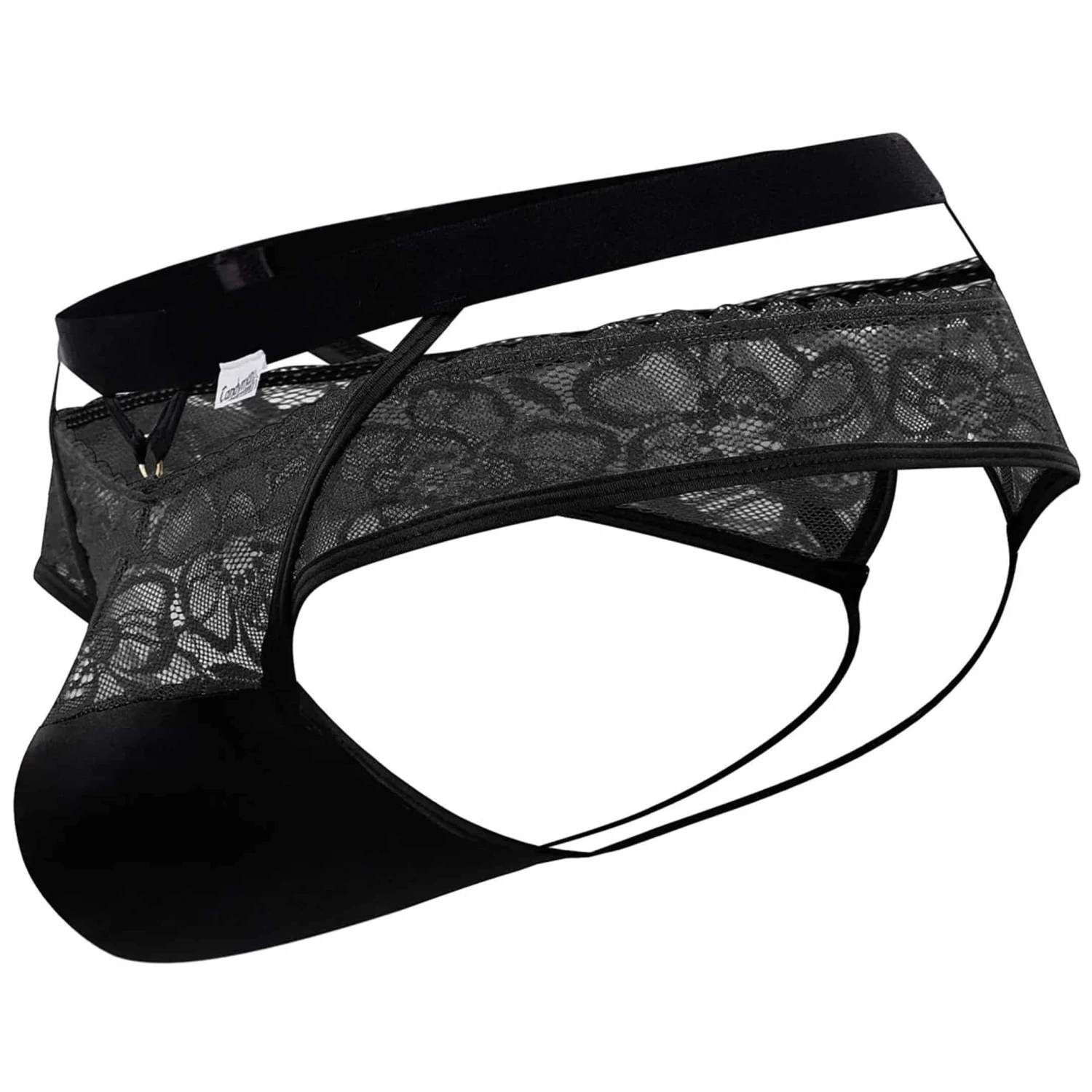 Jockstrap très sexy en dentelle douce et transparente. Coupe originale, sophistiquée et provocante. Poche frontale préformée non doublée.