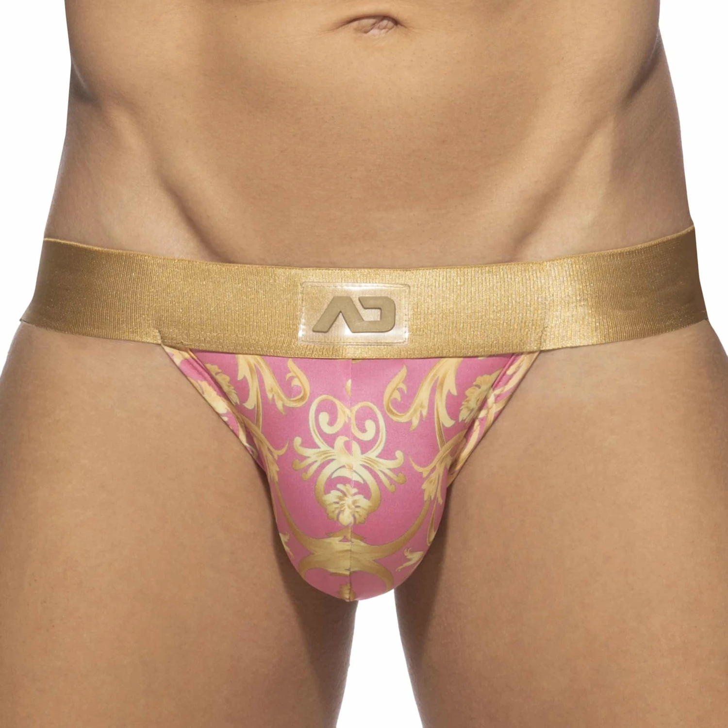 Jockstrap taille basse très sexy en microfibre douce et légère. Motif baroque doré inspiré de Versailles. Grande poche frontale préformée. Ceinture élastique noire et or avec logo AD en silicone.