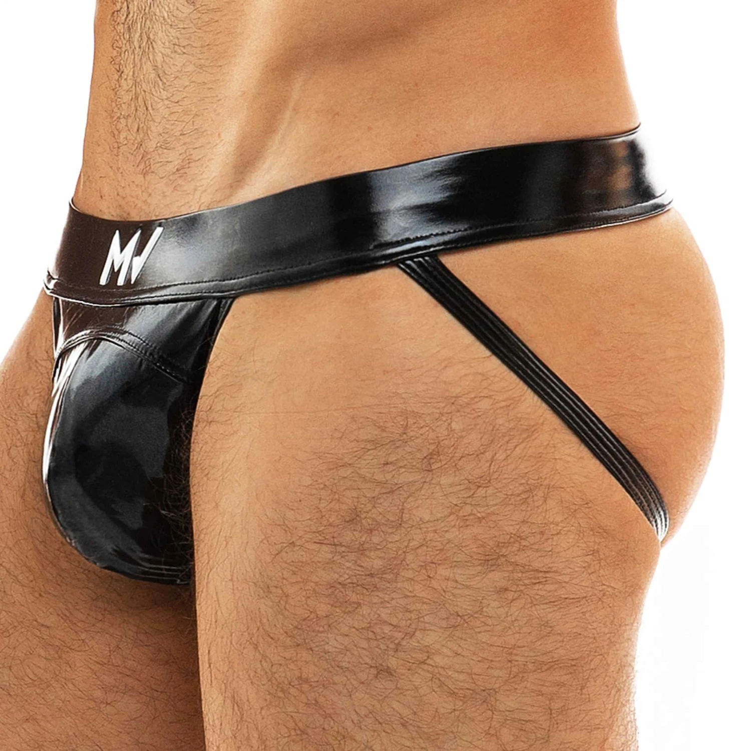 Jockstrap très sexy en vinyle brillant pour un look fetish. Ceinture élastique recouverte signée MV en relief.