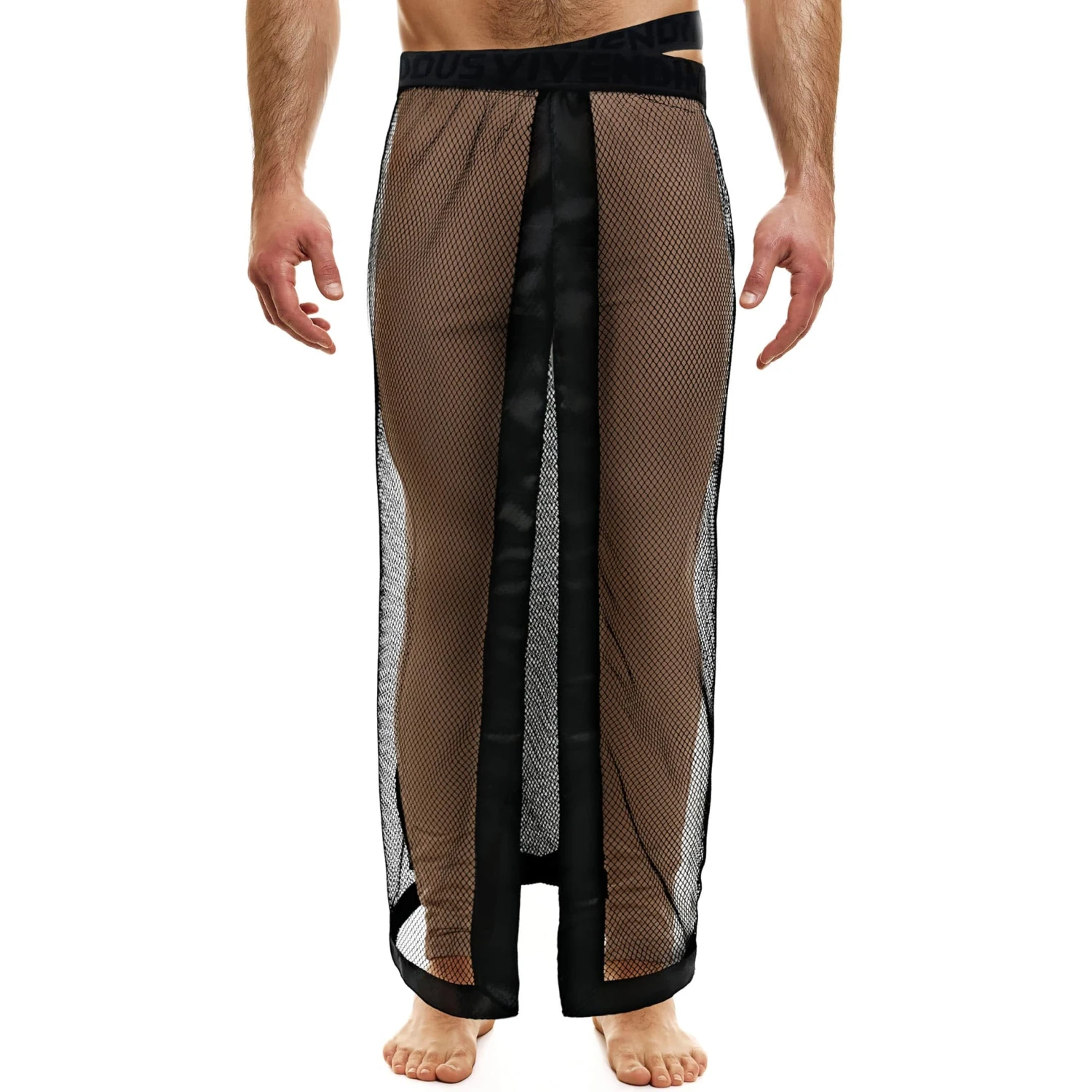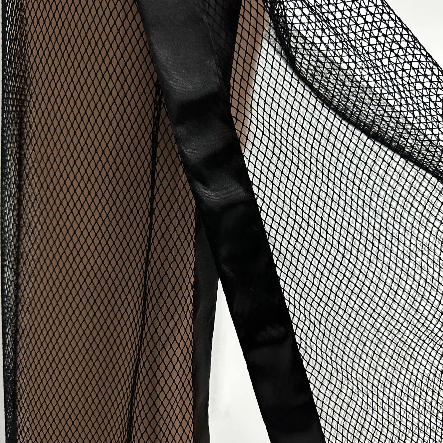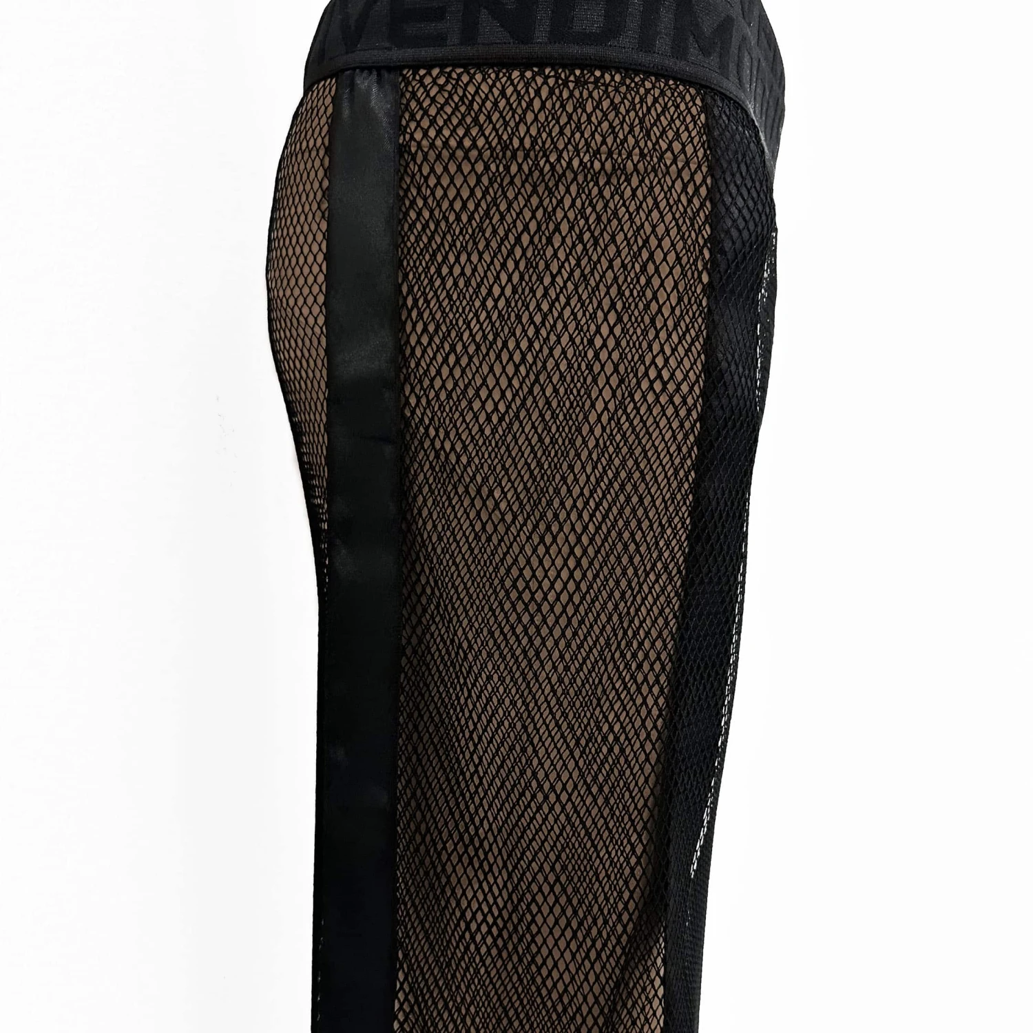 Jupe longue, audacieuse et luxueuse en résille extensible à large maille. Non doublée pour une totale transparence. Constituée de 2 panneaux distincts disposant chacun de sa ceinture élastique signée Modus Vivendi. Bordures satinées.