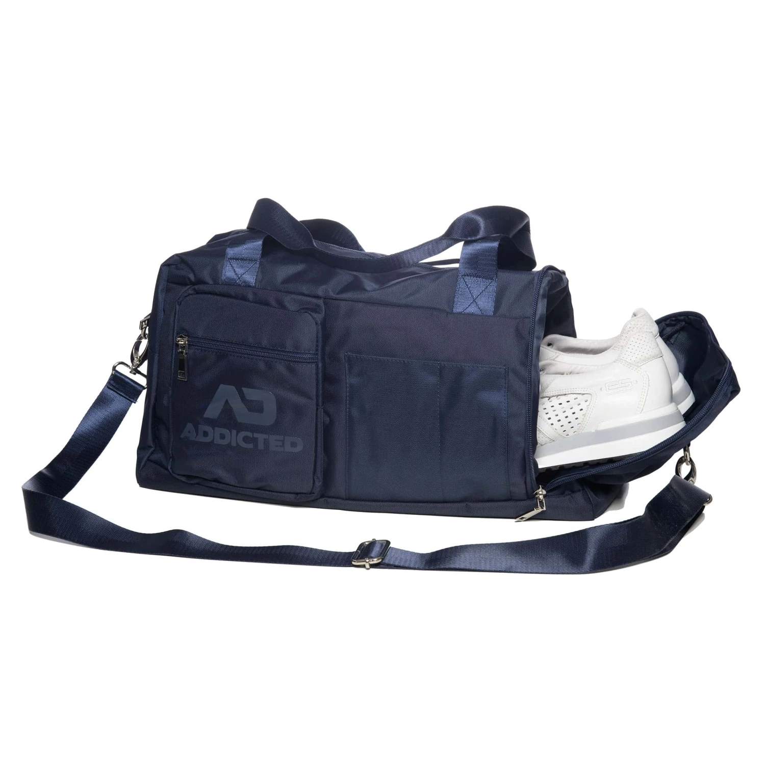Sac de sport en toile légère et résistante. Grande poche zippée pour les chaussures. 2 poches à fermeture Eclair et 2 petits compartiments sur les côtés. Anses et bandoulière. Logo Addicted. Dimensions L 48 x L 21 x H 27 cm.