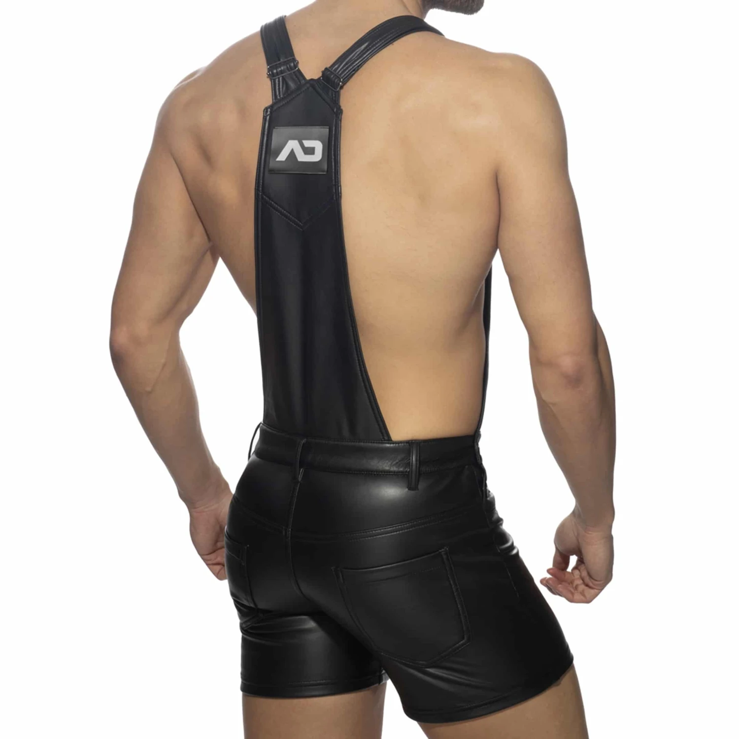 Salopette sexy en simili cuir extensible. Bretelles réglables. 1 poche sur la poitrine, 2 poches latérales et 2 poches arrières. Fermeture à double bouton de chaque côté. Braguette factice. 5 passants de ceinture. Logo AD Fetish en silicone en haut du dos.